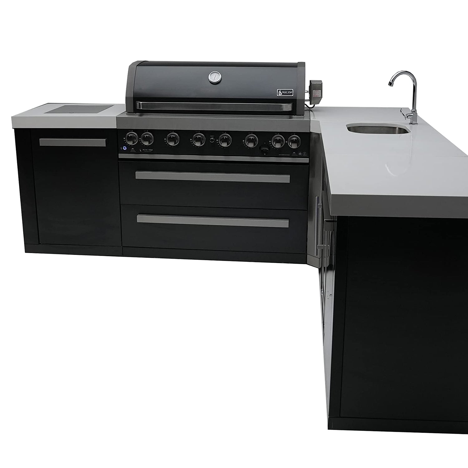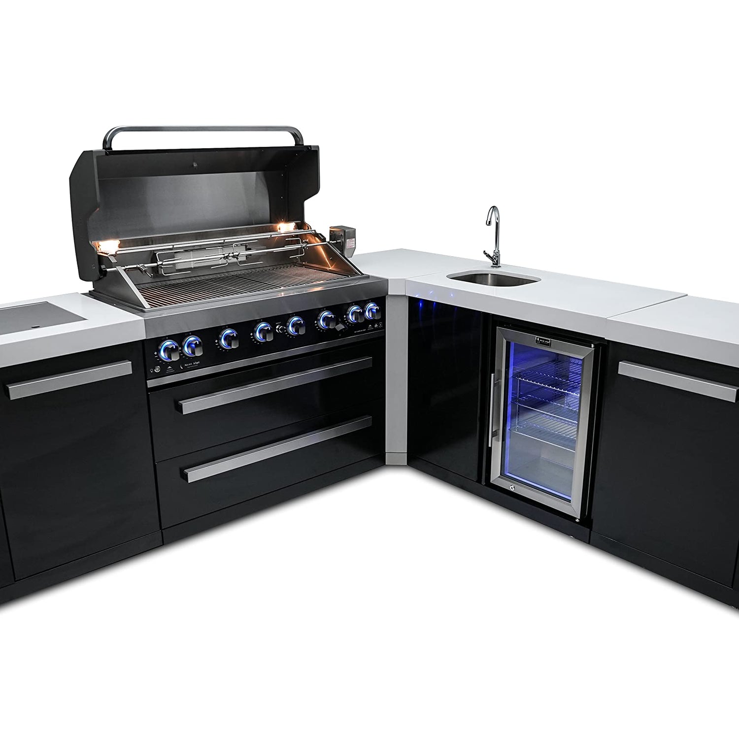 Details: The Mont Alpi Black stainless steel series combines the longevity of stainless steel with the style and class of black. This grill combines six burners of standard cooking size along with an extremely useful infrared side burner suitable for searing, pan frying and boiling and an infrared rear burner and heavy duty rotisserie kit for the ultimate rotisserie experience. The grill comes standard with LED knob lights that are blue when off and red when on and bright internal cooking lights for perfect vision and precision control. The 90 degree beverage module provides extra prep area, an outdoor rated refrigerator with LED internal lights and 6 settings plus a sink and faucet. The Mont Alpi Black series comes with counter granite for easy cleaning and extra class. Be sure to check out the useful optional accessories such as the heavy duty rotisserie kit, charcoal tray and griddle. Grill comes as propane ready but can be converted to Nat gas within minutes, simply buy the additional Mont Alpi Natural gas conversion kit.