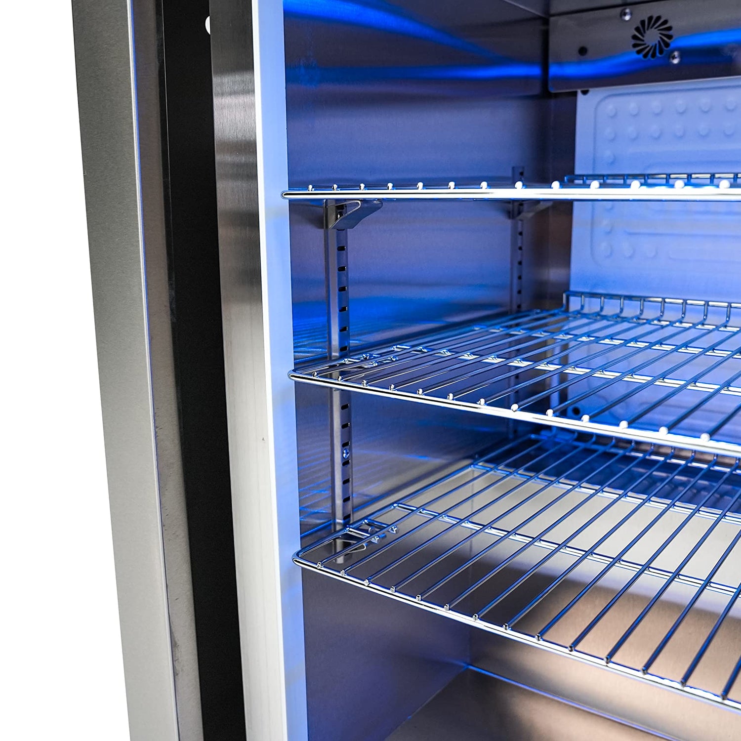 - REFRIGERATOR FEATURES - The outdoor rated MAF refrigerator is made with heavy duty 304 stainless steel construction for durability and resistance to the elements. It comes with a stylish glass door for easy viewing of contents and interior blue LED lighting as well to improve visibility and overall user experience. Additional features include temperature control, adjustable shelves, and a lockable door to secure contents and prevent unauthorized access. Dimensions - 18 1/2” x 17” x 27”