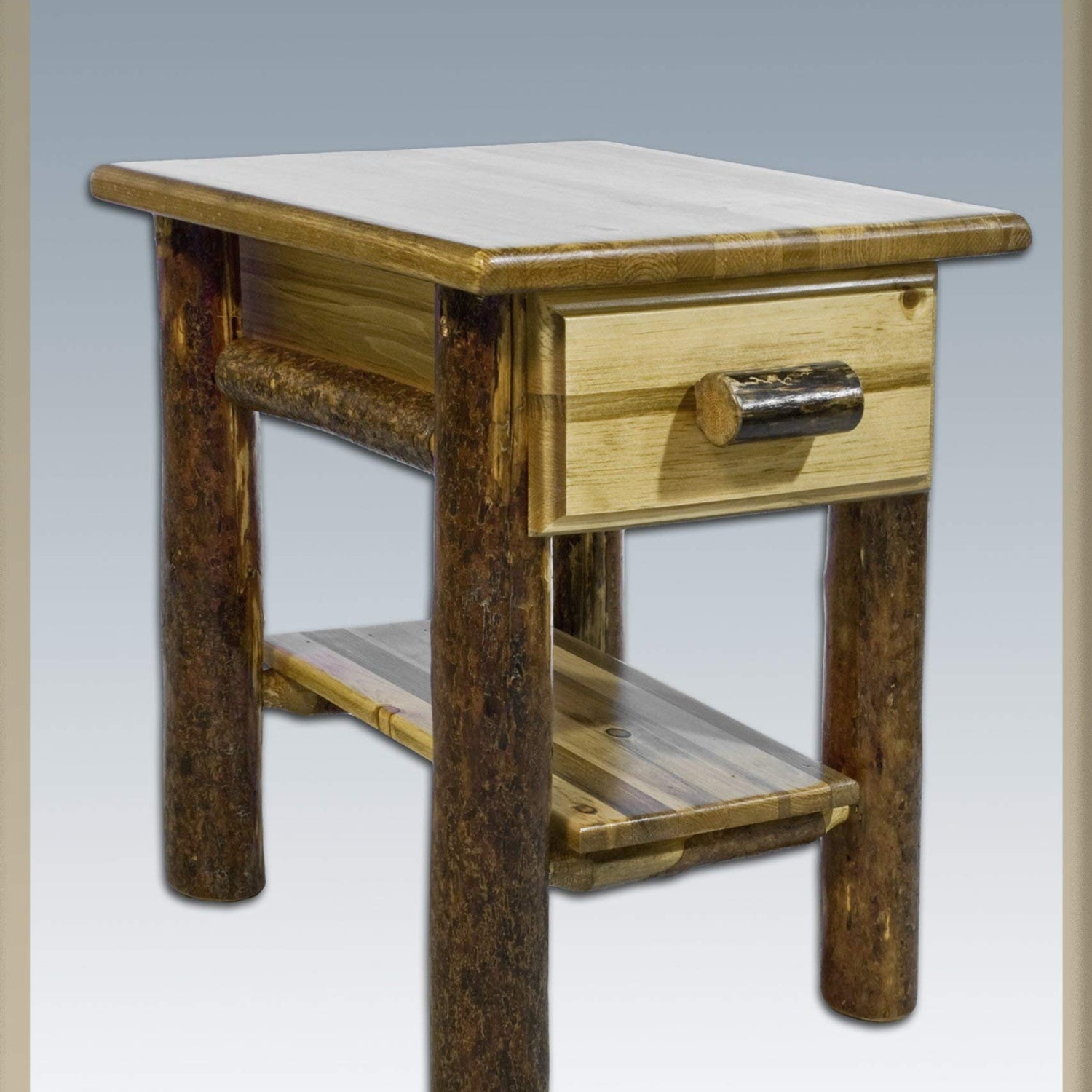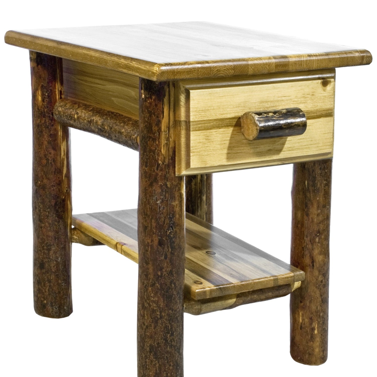 - Multi-use nightstand/end table features a spacious drawer and shelf^Professionally finished in the Unique Glacier Country Collection Style stain and lacquer^Spacious drawer measures 11" W by 17" D by 5" H; fully assembled; 20-year limited warranty from manufacturer^Epoxy Coated Steel "Easy Close" Slides with High Quality Nylon Rollers Ensure Ease of Use and Longevity^Hand crafted in Montana with American grown, genuine lodge pole pine; Fully assembled; 20-year limited warranty from manufacturer