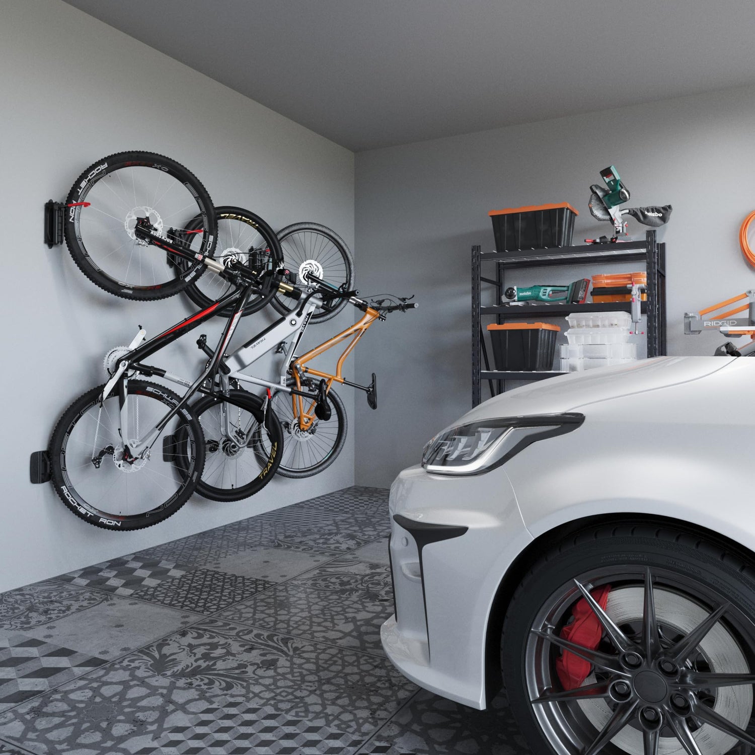 - ăUpgraded 150° Swivel Designă Swivel design with bearing system, bike hangers for garage conveniently stores bikes in center, left or right-angled position, simply pivot your bike left or right with a +65°/-85° swivel range. The swivel system allows you to store bike flush against the wall, making it a convenient storage solution around parked cars and inside apartments.