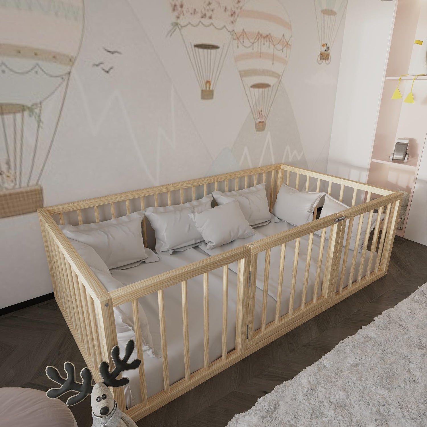 Montessori Floor Bed with Door for Toddler 39.4'' x 75.2'' Twin Size | Pine Wood Natural Solid Frame Bed Door in the Middle | Sturdy Design Floor Bed Frame Boy and Girls (Twin, Height : 23.6 Inches)