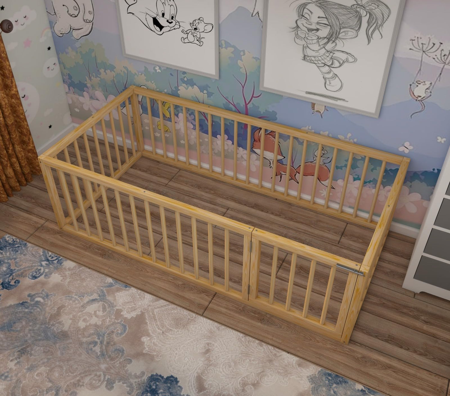 Montessori Floor Bed With Door On The Right Side For Toddler | Pine Wood Natural Solid Frame Bed | Sturdy Modern Design Floor Bed Frame for Boy and Girls (Crib, Height: 23.6 Inches)