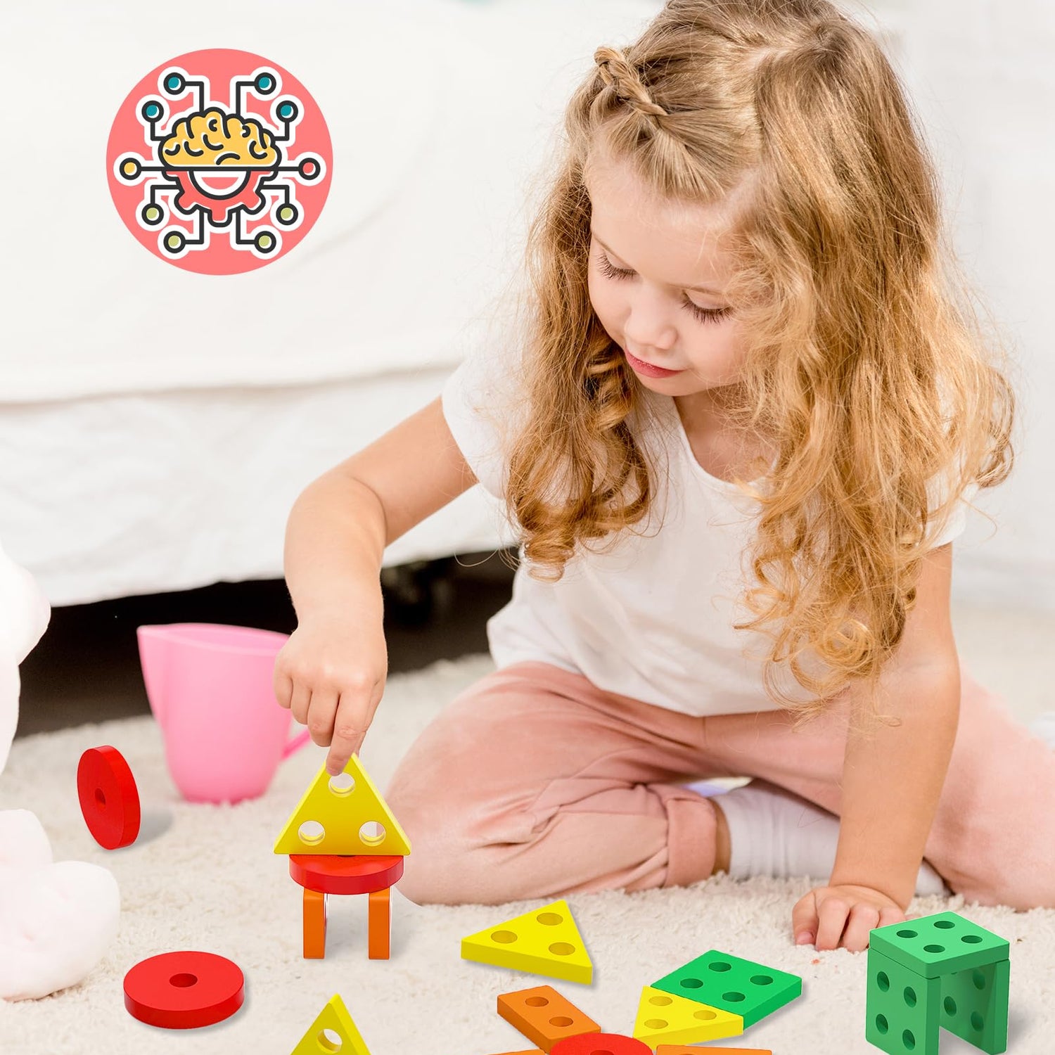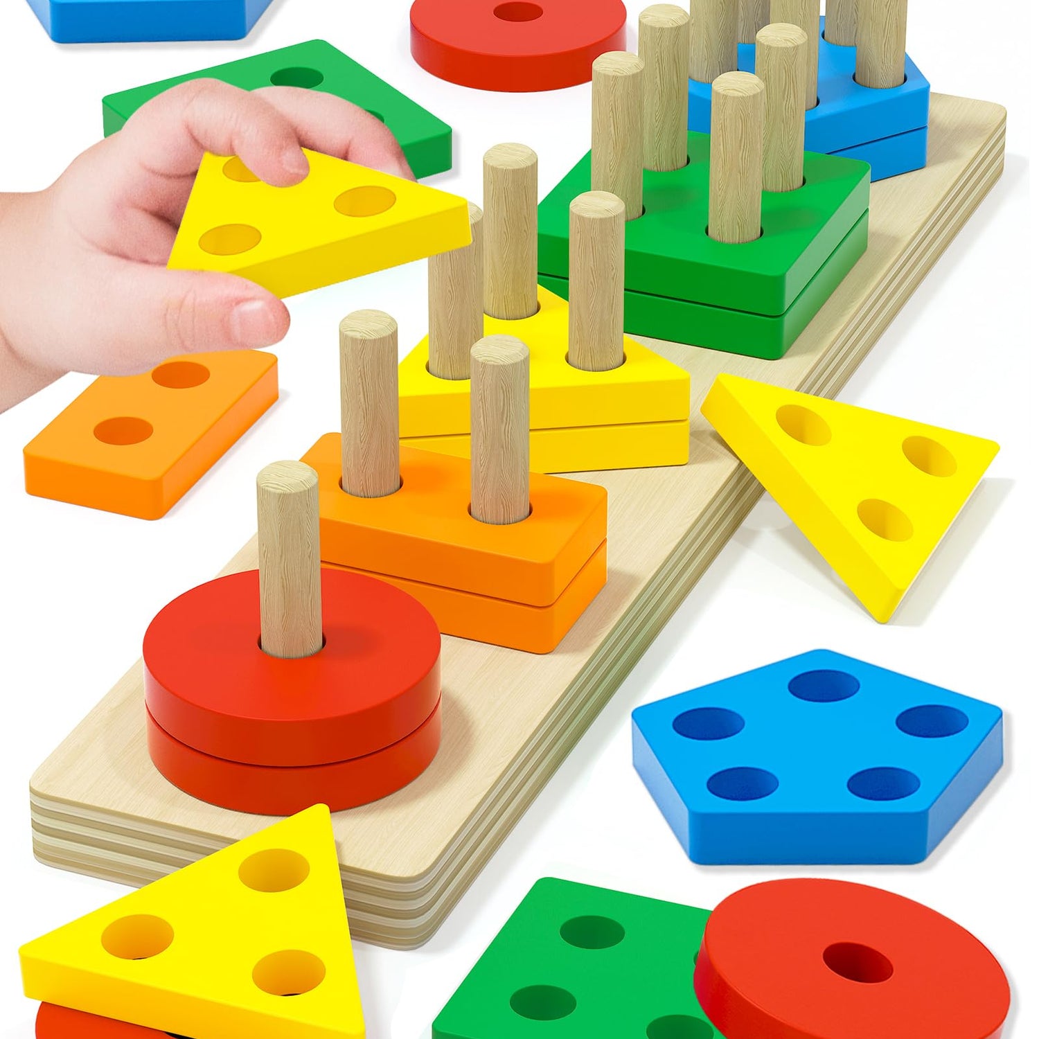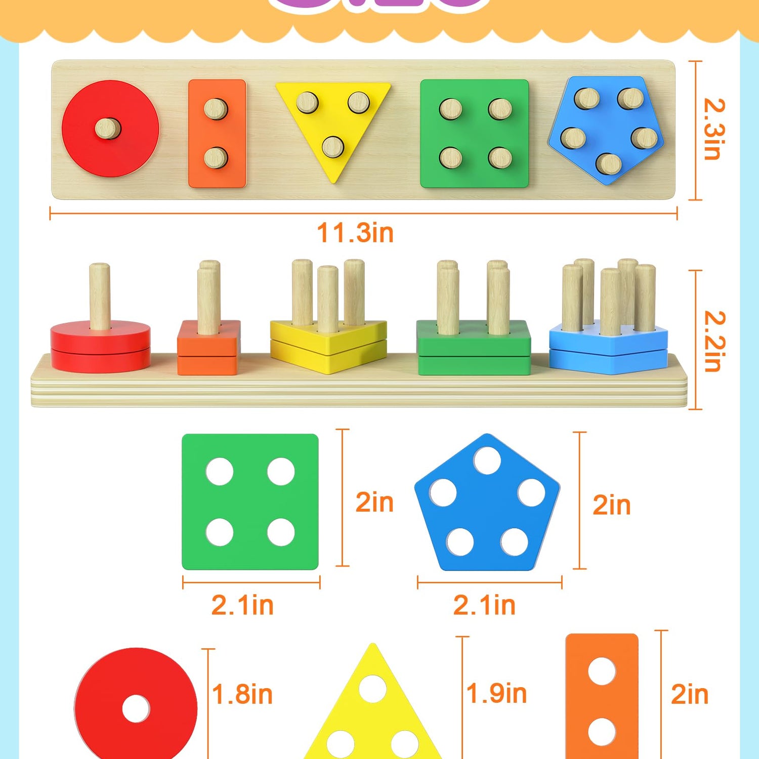 - Montessori toys for toddlers : Wooden sorting and stacking puzzle contains 20 pieces including five colors: red, orange, yellow, green and blue, and five shapes: pentagon, square, rectangle, triangle and circle. It provides a variety of collocation and play possibilities, starting from the basic color and shape, to cultivate children's hand-eye cooperation ability, color recognition, fine motor skills, mathematical ability, physical spatial thinking and independent ability to solve problems. Is a fun and challenges of baby toys, together with you to explore children's creative ability.