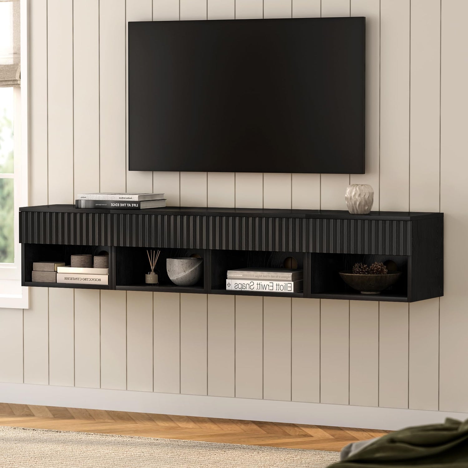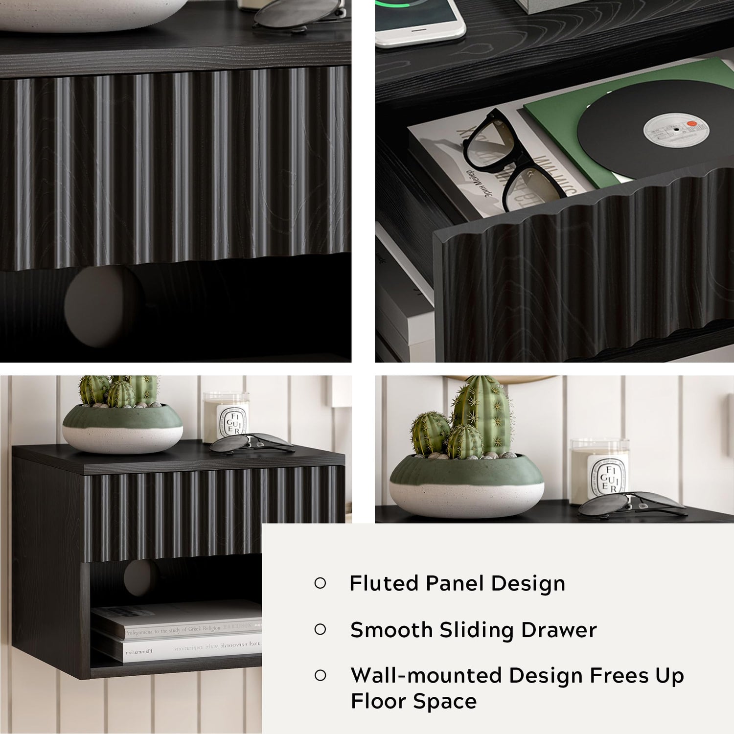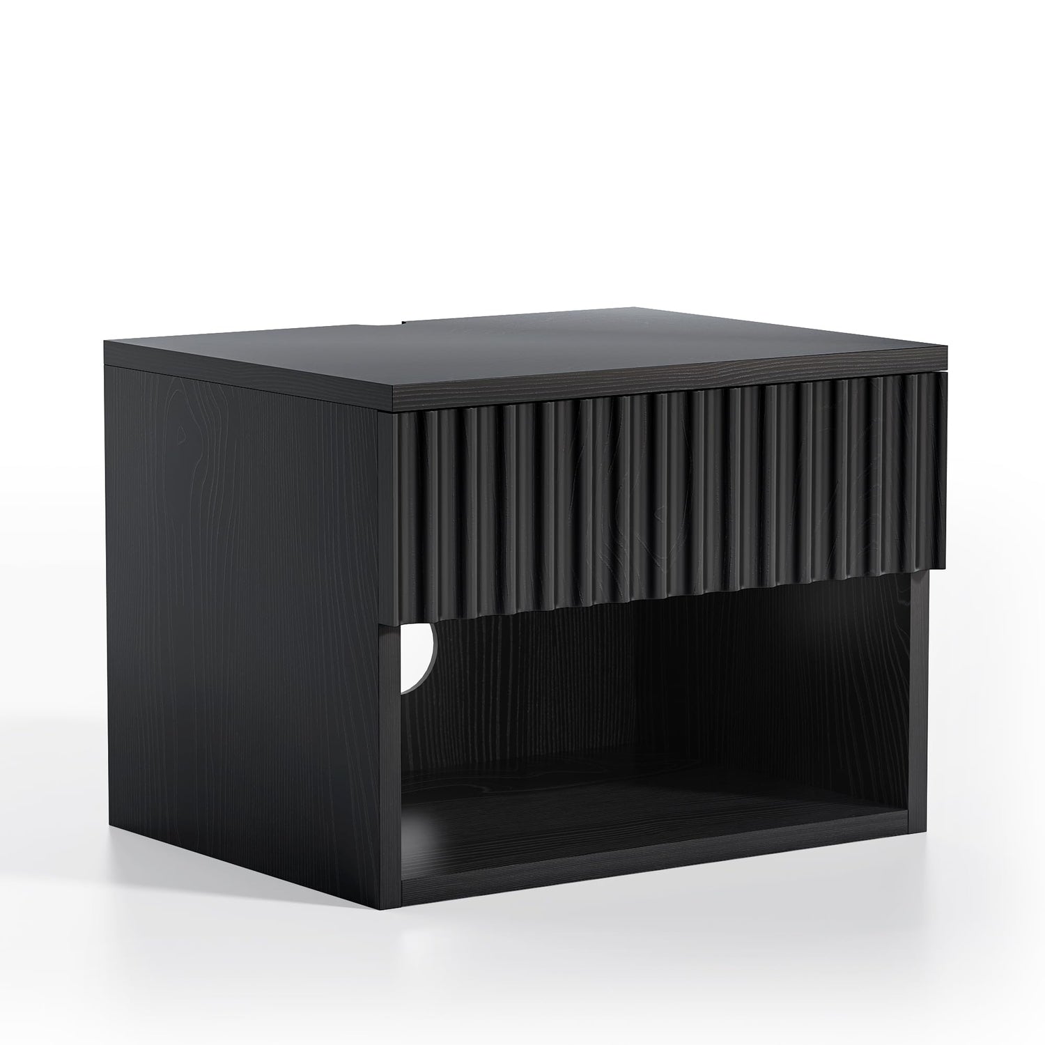 Details: MoomJiee Floating Nightstands Set of 2 with Drawer and Open Shelf, Small Wall Mounted Bedside End Table, Modern Fluted Night Stand for Bedroom, Living room, Black