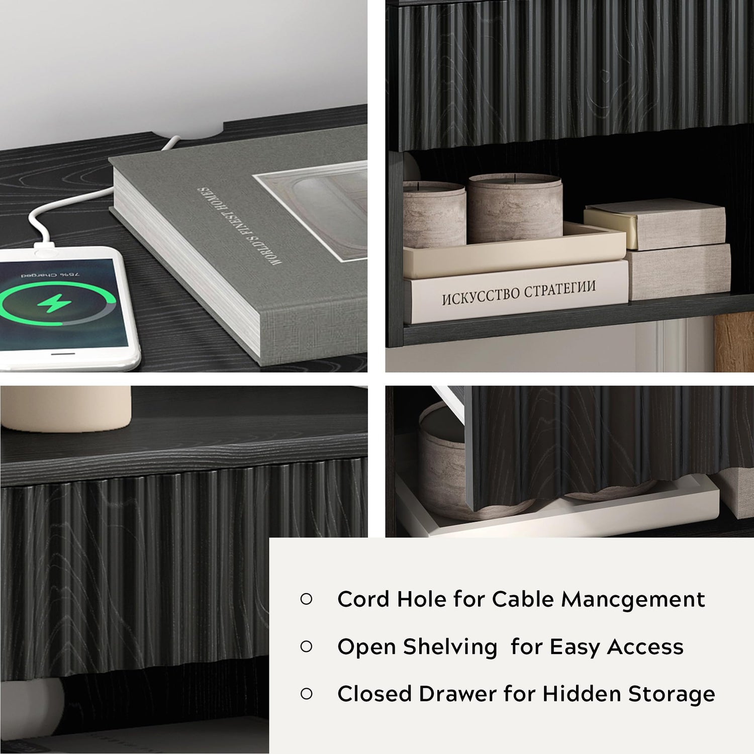 - Stay Clutter-Free: Say goodbye to messy cables and clutter! The cord hole simplifies cable management, while the closed drawers and open spaces offer ample storage for all your necessities. The wall-mounted studs provide strong support for added stability and safety