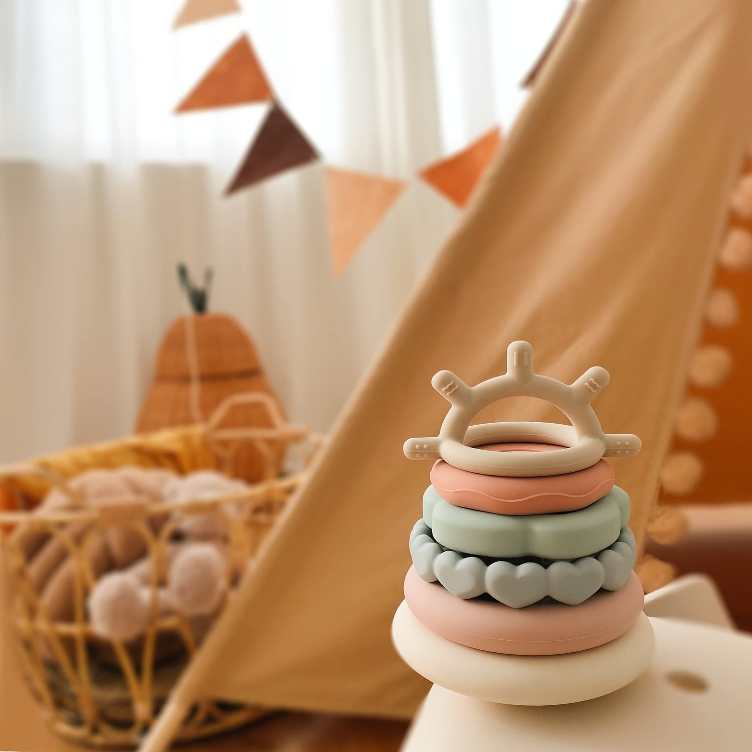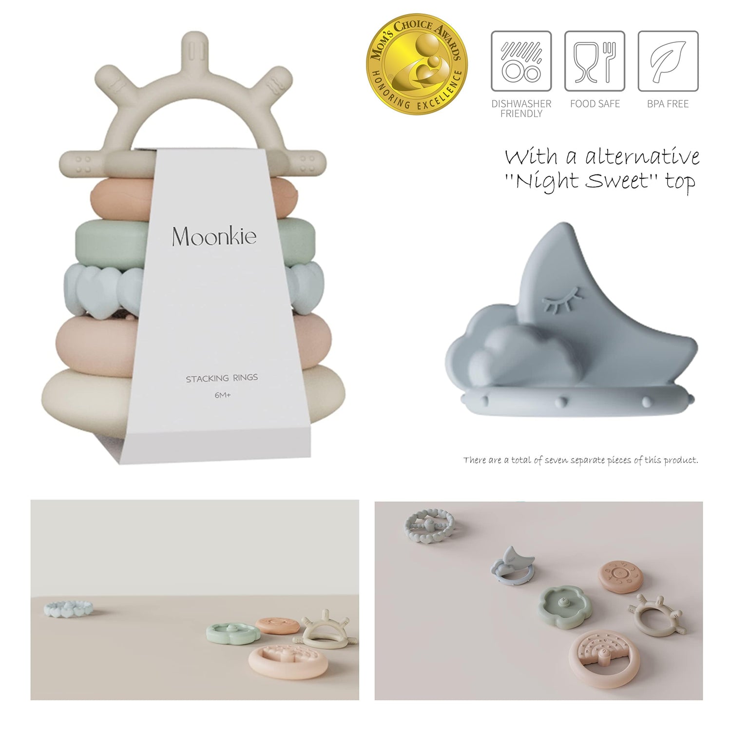 - ✨ VERSATILE TEETHING TOY: Moonkie's baby teething rings are not only great for stacking games but also serve as a safe and soft teether for your baby to chew on. Made from high-quality food-grade silicone, you can let your baby bite our teething rings without worrying about harmful ingredient.