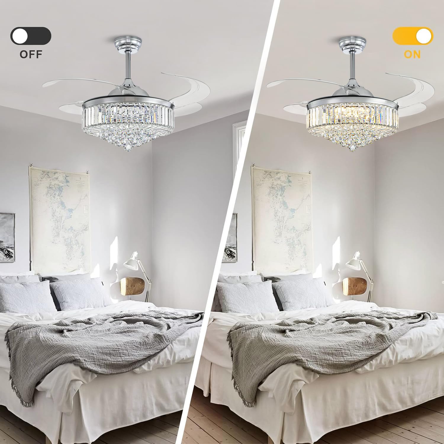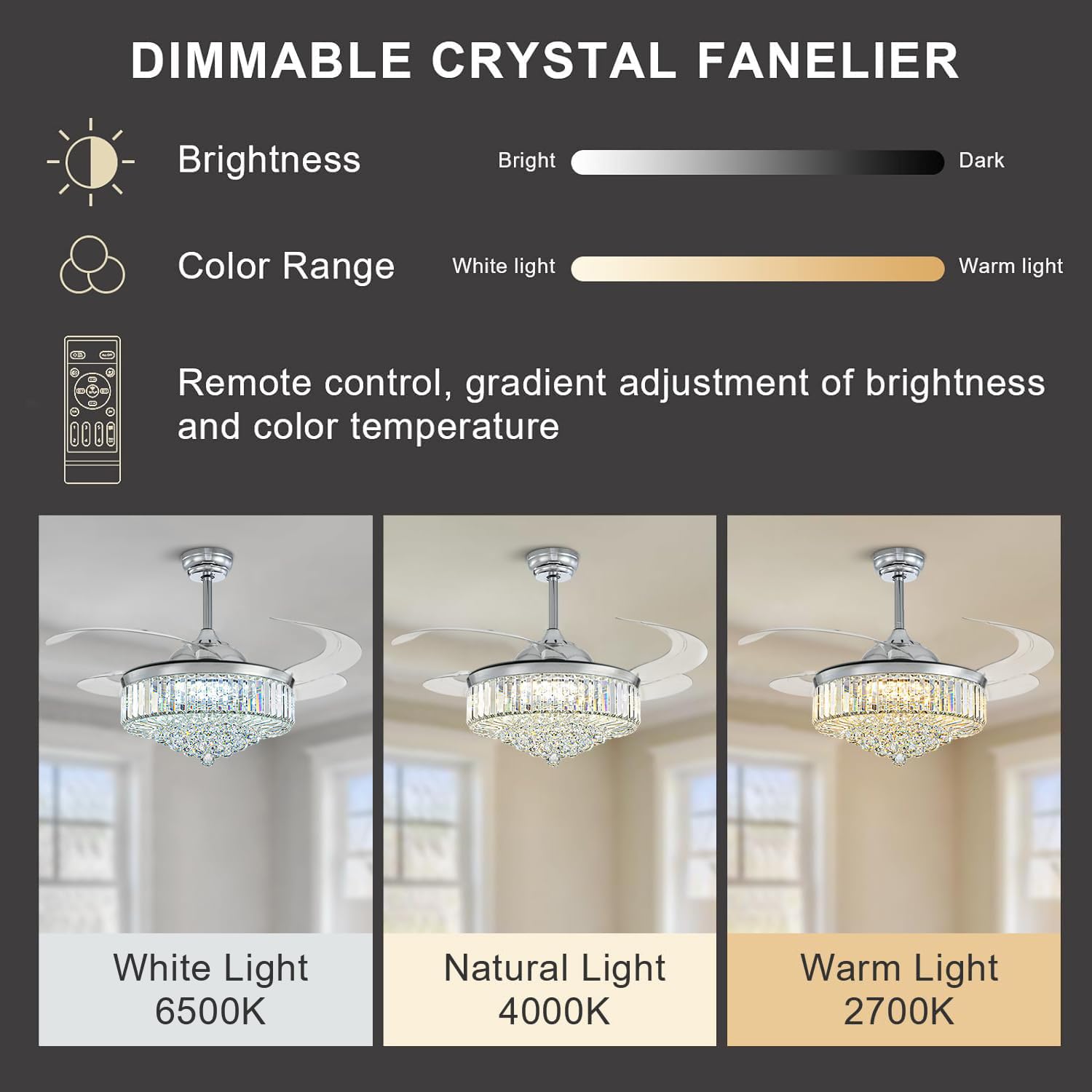 - 【Dimmable Fan Light】 Dimming feature retractable ceiling fan with crystals. Light brightness adjustable. Color temperature can be changed from 2700K (Warm white) to 4500K (Day light) and end with 6000K (Cool White). Light Souce: 72-watt LED panel, replaceable.