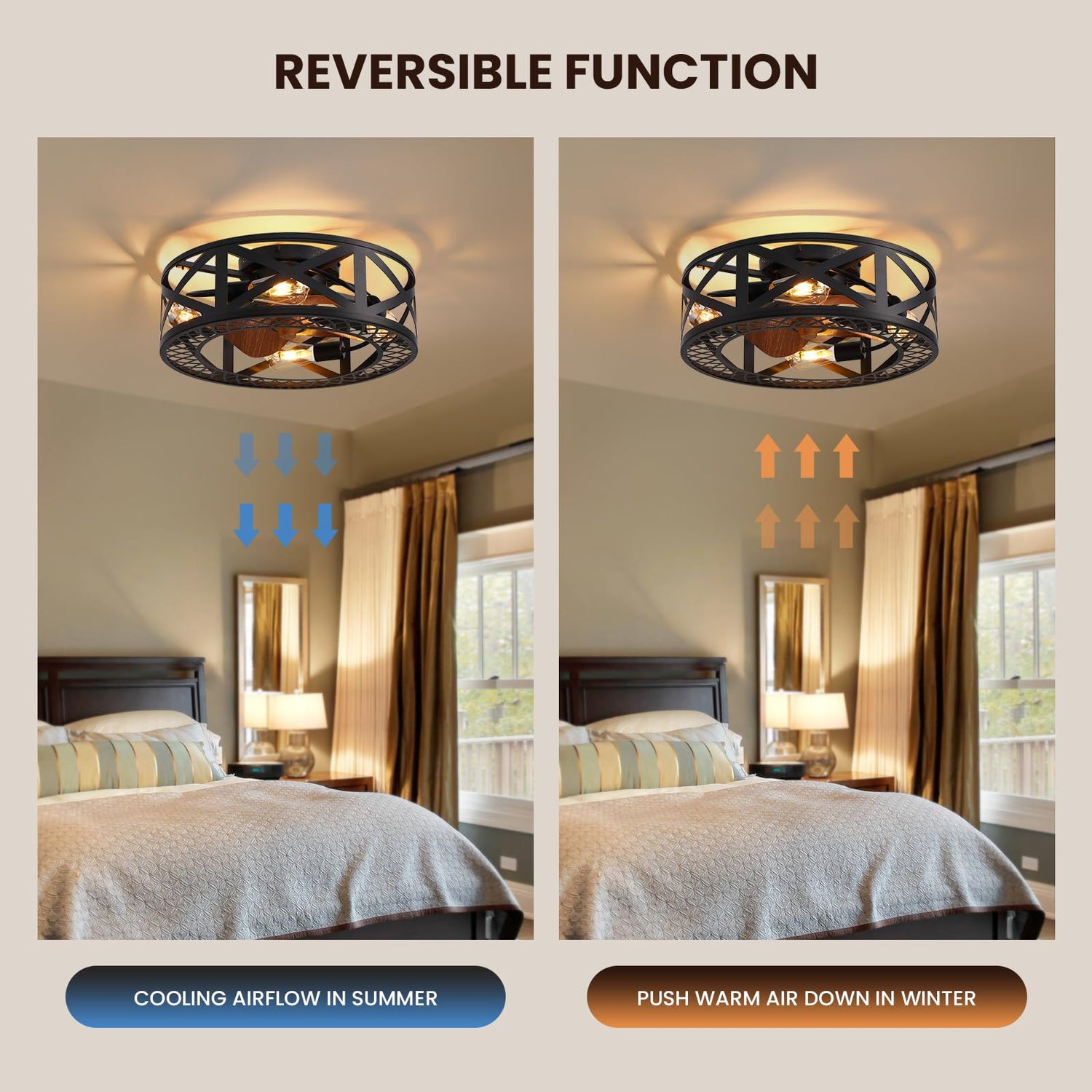 - 【Reversible Ceiling Fan】: All-season operation, reverse wind could be used for circulating the stagnant air indoors for winter. Powerful forward wind cooling room down quickly for summer.