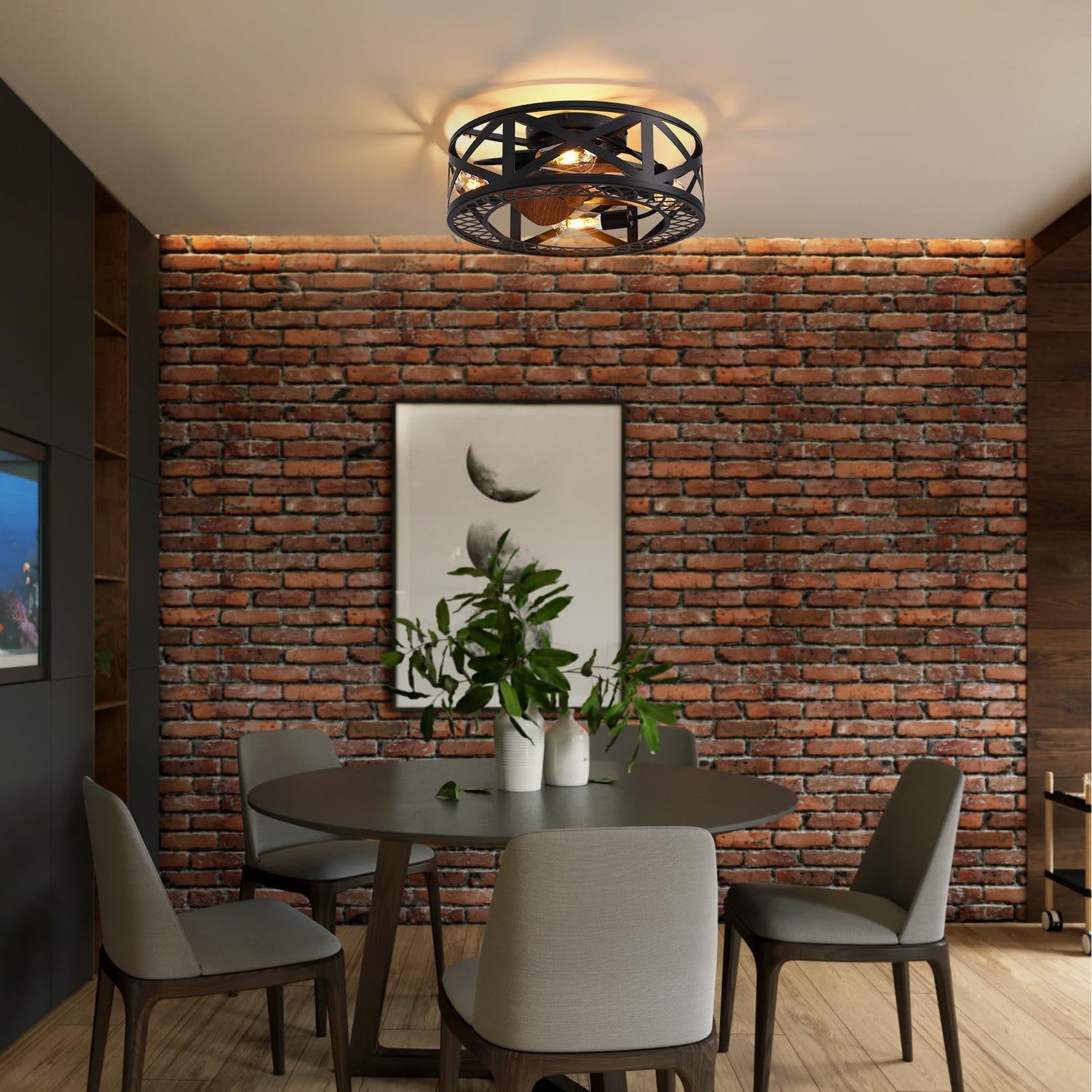 - 【Unique Design】: The industrial style is back and now you can get the same look in this black caged ceiling fan. This Industrial ceiling fan lights fixture consists of a black cage covering four lights and three wood grain blades—the perfect size for a loft, office space nursery room, or children's room.