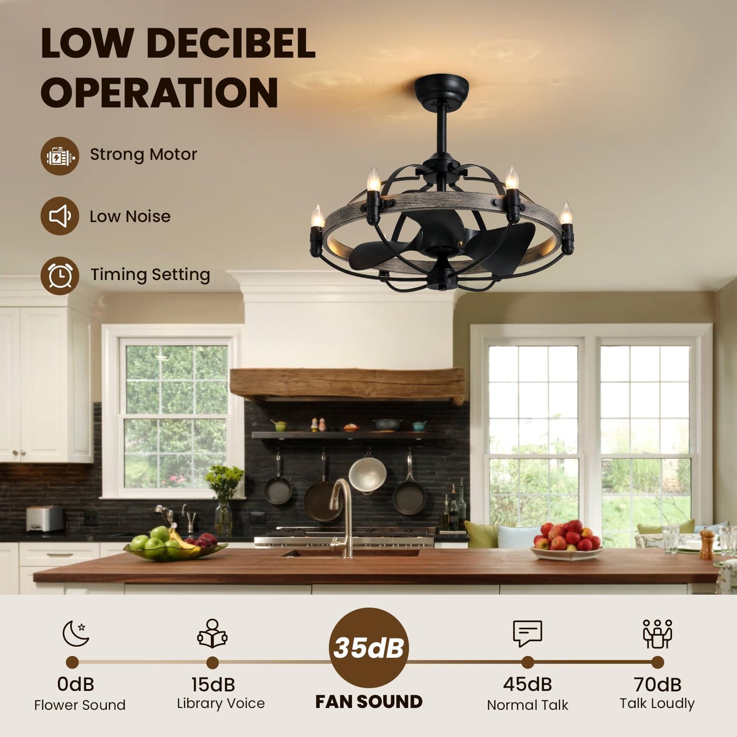 - 【Unique Design】: The farmhouse style is back and now you can get the same look in this candle chandelier fan with light. This 27" ceiling fan features a grayish brown finish cage and 3 downrods for different height options—the perfect combination of style and convenience.