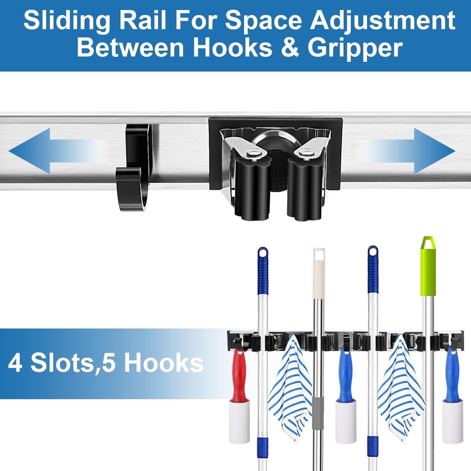 - 【Space Saving Mop and Broom Holder Wall Mount】No more messy closet or loose items laying around. Our broom hanger wall mount comes with 4 slots and 5 hanger hooks, allows you to wall hanging various floor cleaning supplies, like mops, brooms, dustpans, and vacuums etc.
