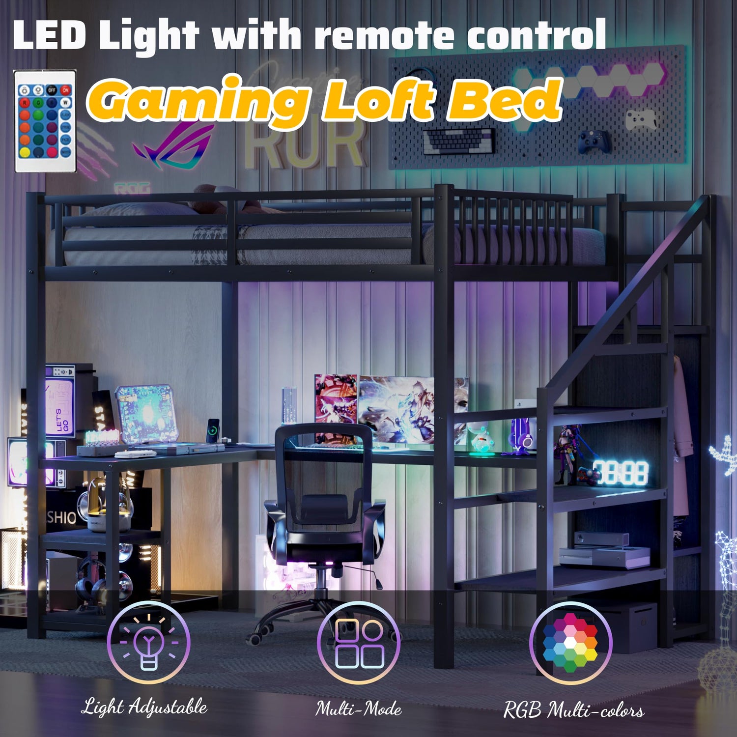 MoproBeti Full Size Loft Bed with Desk and Stairs,Metal Gaming Loft Bed Full with Wardrobe and Shelf, High Loft Bed with LED & USB Charging Station for Teens, Adults, Space Saving Design,Black