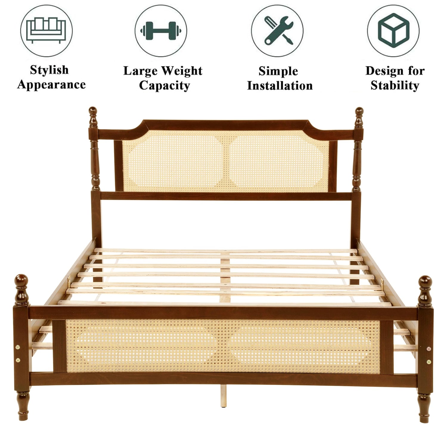 MoproBeti Queen Bed Frame with Rattan Headboard and Footboard, Rubber Wood Platform Bed Frame with Large Under Bed Storage,Boho and Mid Century Style, No Box Spring Needed, Easy Assembly,Walnut