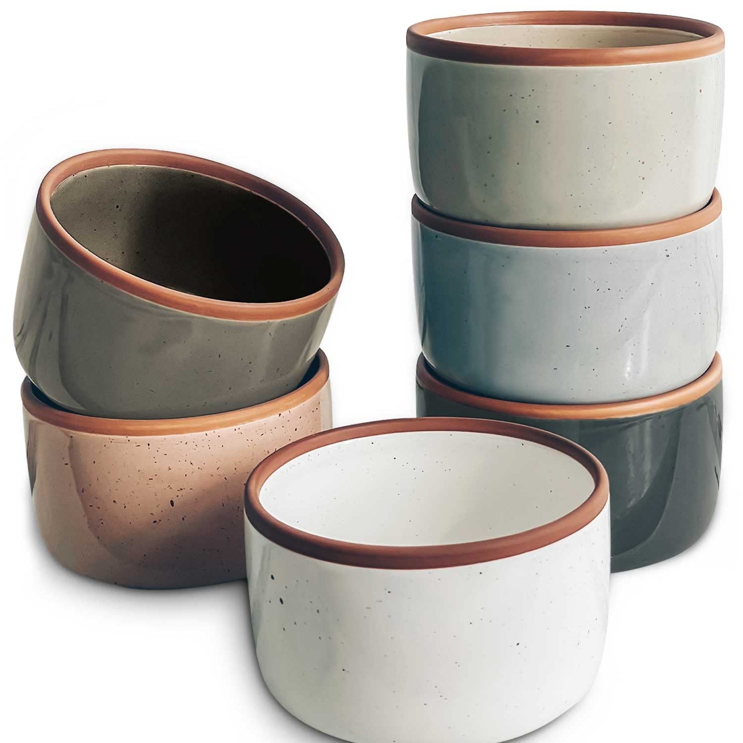 Mora Ceramic Ramekins - 8oz, Set of 6 - Small Oven Safe Baking Dishes/Cups - For Personal Pudding, Creme Brulee, Souffle, Serving Dip, Custard, Ice Cream - Single Mini Bowls - Assorted Neutrals