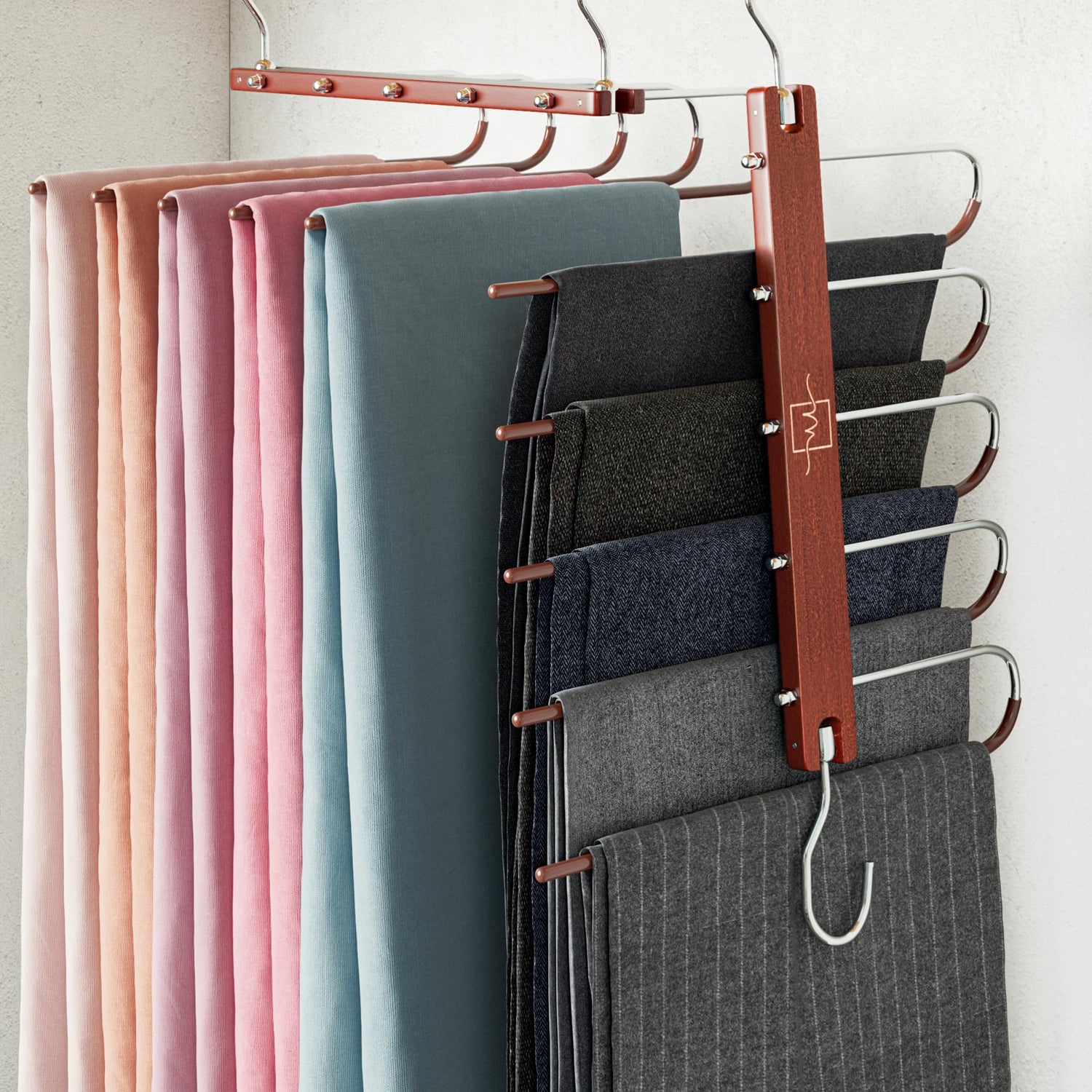 - MULTIUSE SPACE SAVING ORGANIZATION - Our clothes hangers space saving wardrobe organizer goes beyond pants hangers for men and women. Our multi hanger sets are slack hangers, a jeans organizer for closets, skirt organizer hangers, trouser hangers, scarf organizers and more giving a complete multifunctional pants rack.