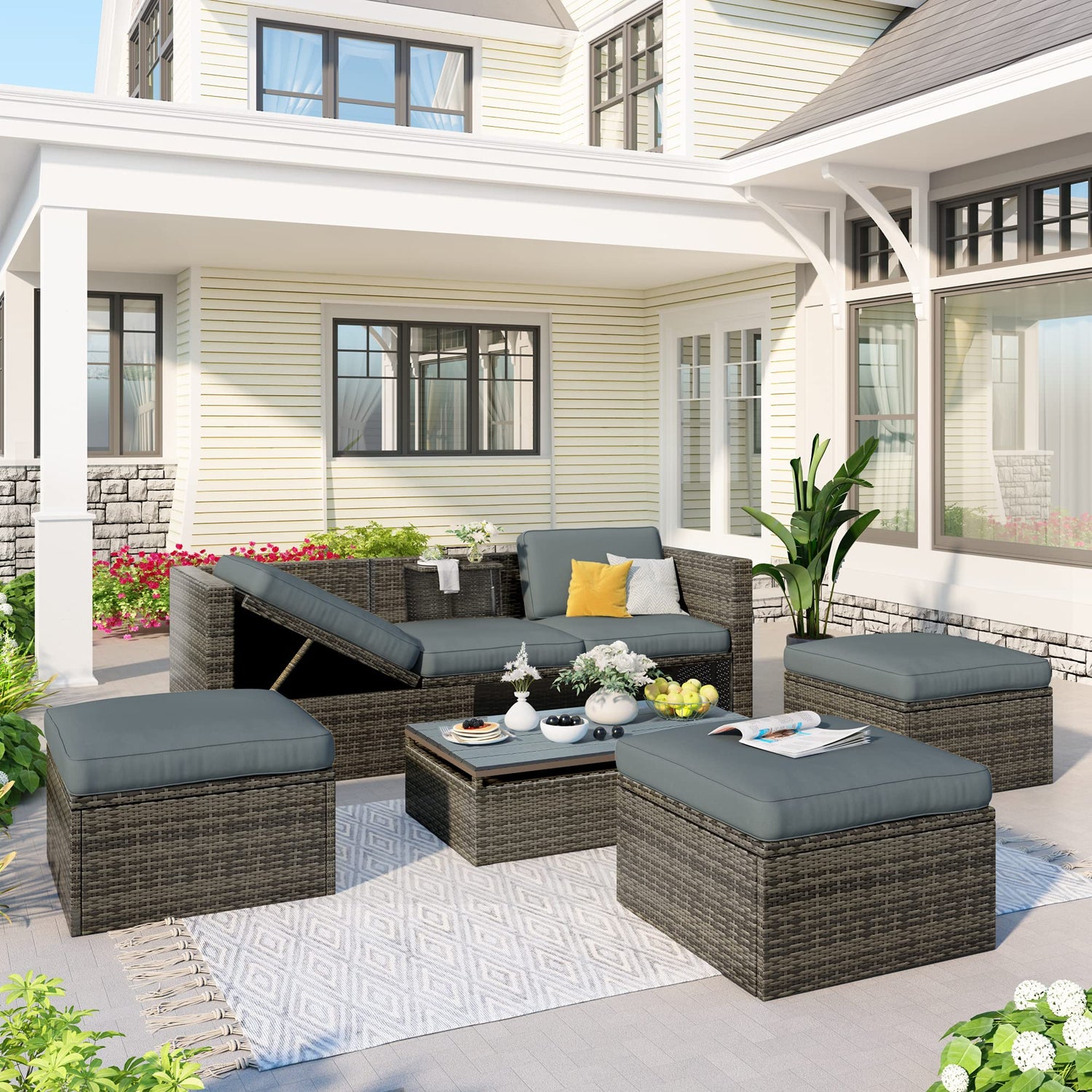 Morhome 5 Pieces Patio Furniture Sets All Weather Wicker Rattan Sectional Sofa Outdoor Conversation with Adustable Backrest, Cushions, Ottomans and Lift Top Coffee Table for Poolside, Garden, Backyard