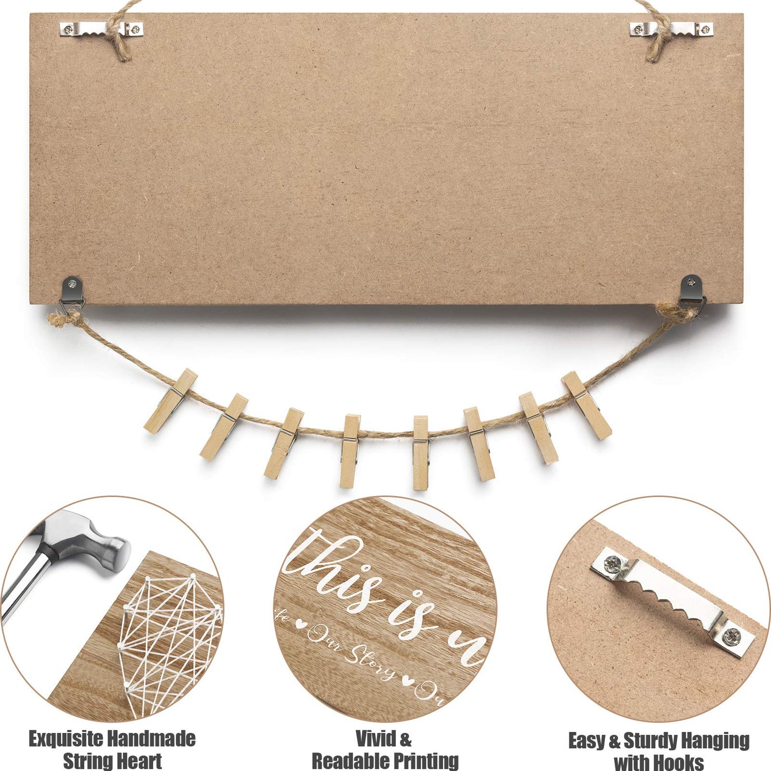 - 🎉PERFECT SIZE & EASY MOUNTING:This Couples Gifts photo frame measures about 13.5 x 5.5 inch and come with 8 stylish wooden clips (2 for easy replacement) to hang and display family photos, It will comfortably fit 4x6 inches and any smaller size photos! Come with 2 jute ropes, back sawtooth hangers and triangle hook (Mounting hardware and ropes are included), this new home gifts frame is easy to hang on the wall.
