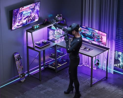 MOTPK 45 Inch L Shaped Gaming Desk with Power Outlet & LED Lights, Computer Table with Corner Desktop Showcase for CPU Stand, Display Storage Shelf, Carbon Fiber Surface, Black