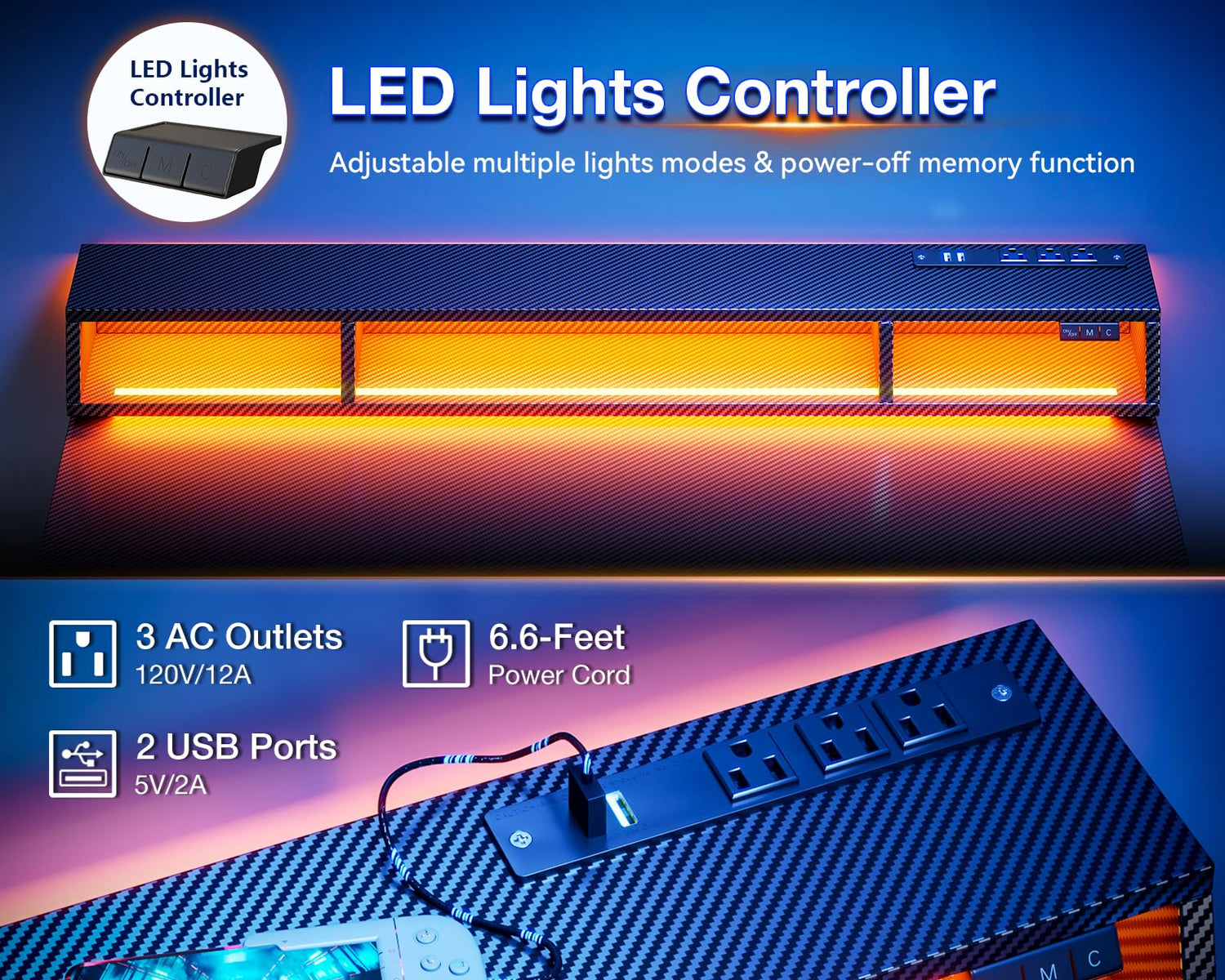 - Power & LED Lights: This gaming computer desk includes a built-in power outlet with 3 Outlets & 2 USB Ports to charge your devices. Also, you can use the LED Lights to vary the 20 light modes to bring more gaming atmosphere to your space.
