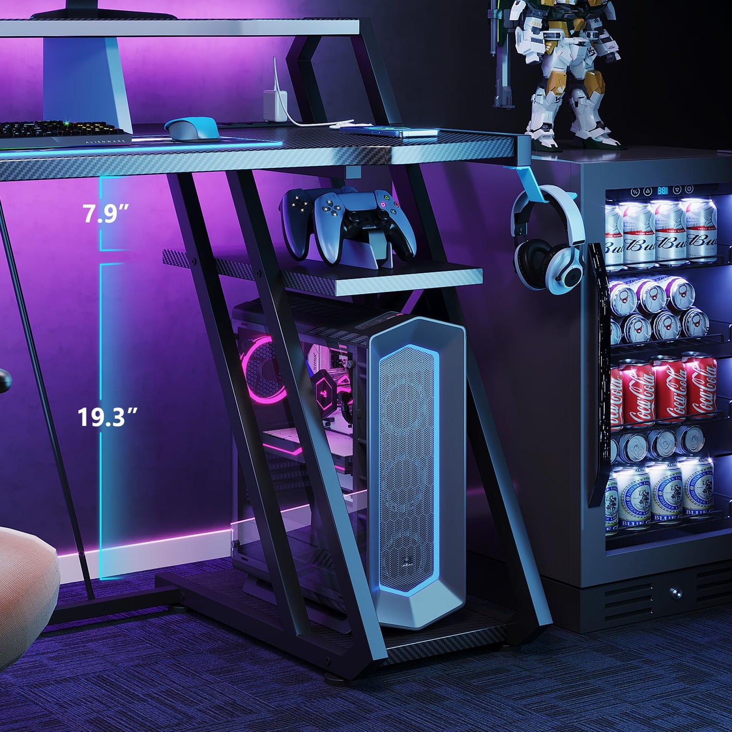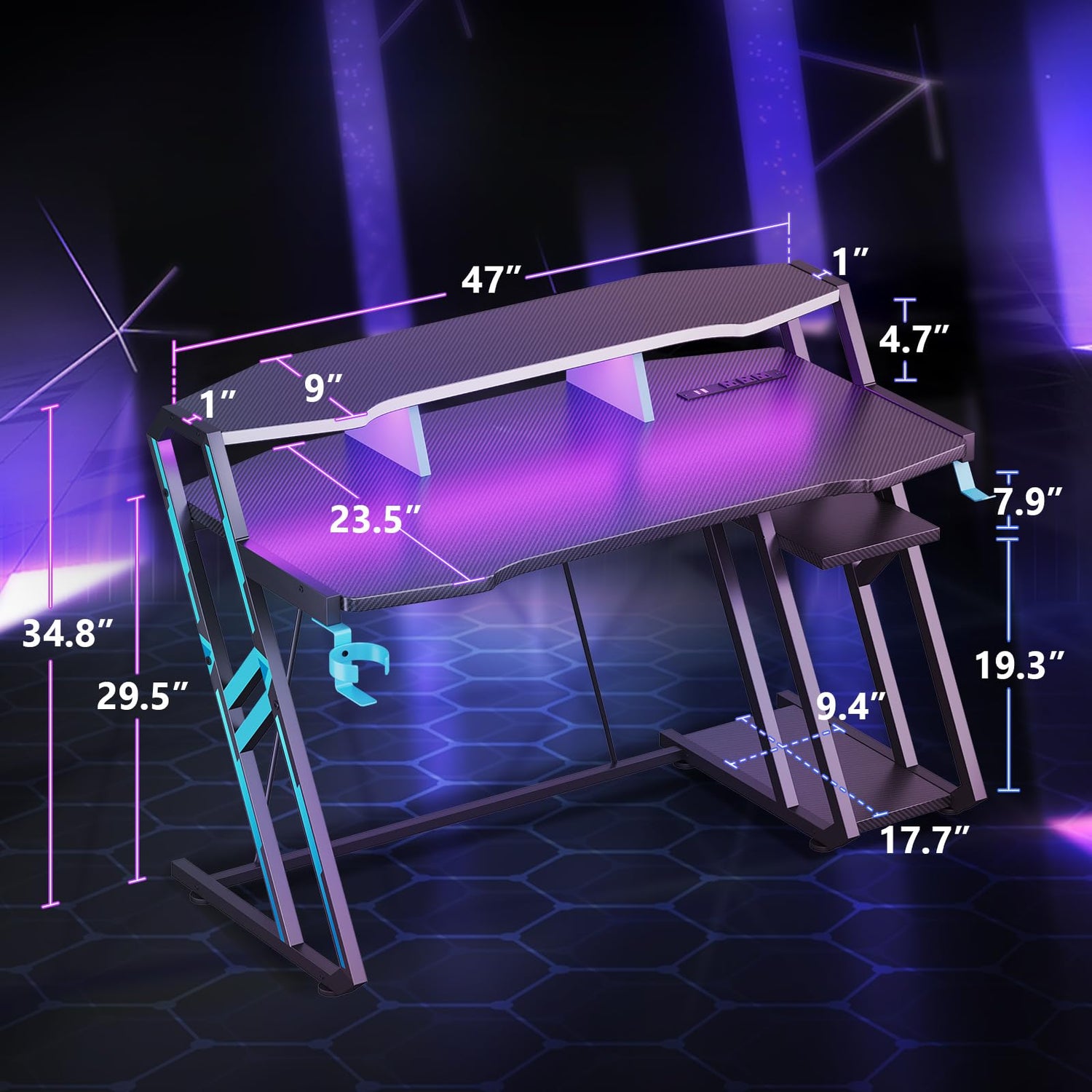 MOTPK Gaming Desk with Power Outlet & LED Lights, Gaming Computer Desk 47inch with PC Storage Shelf, Gaming Table with Carbon Fiber Texture, Gamer Desk, Gift for Boys Men, Black