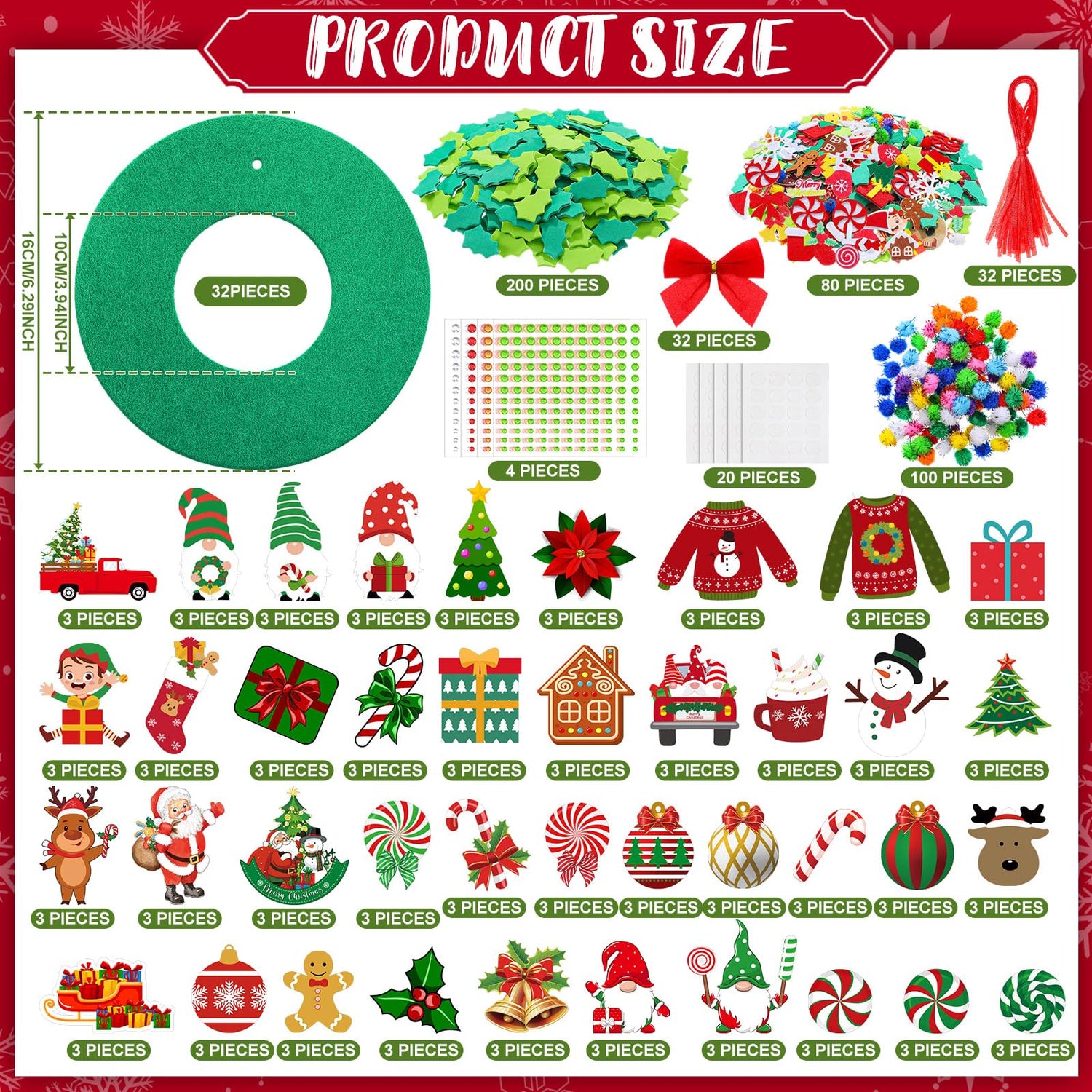 - Package Includes: every package has 620 pieces Christmas crafts; This ample quantity ensures that you have a variety of choices to create your holiday masterpieces, 32 pcs Christmas garlands, 32 pcs ribbons, 200 pcs foam leaf, 120 pcs felt Christmas stickers, 100 pcs Christmas balls, 20 pcs glue stickers, 32 pcs bows and 4 pcs red green yellow stickers, 80 pcs Christmas sticker with glue