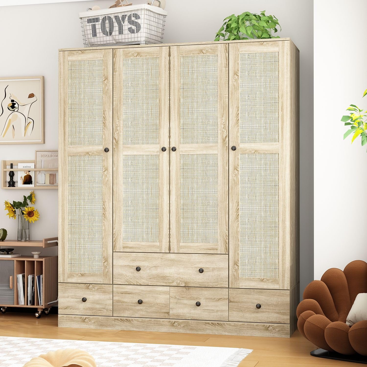 MOUMON 4 Rattan Door Wardrobe with Shelves and Drawers, Armoire Wardrobe with 2 Clothing Rods, Armoires and Wardrobes for Bedroom Oak (59”W x 19”D x 70.9”H)