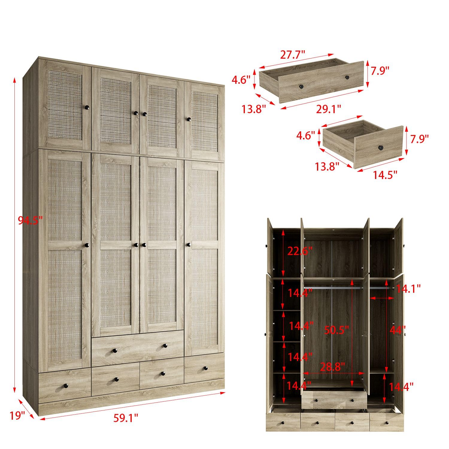 Details: MOUMON 4 Rattan Door Wardrobe with Shelves and Drawers, Armoire Wardrobe with 2 Clothing Rods, Top Storage, Closet for Bedroom Oak 19" D x 59”W x 94.5”H