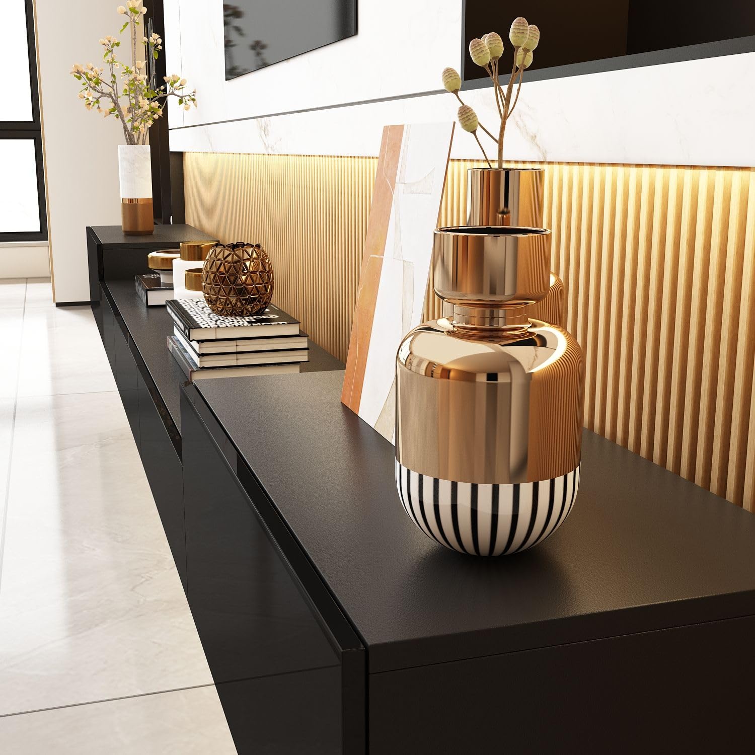 - Modern & Fashion - Compact appearance and pure black color gives a timeless look for your living space. The high gloss drawer fronts add a modern touch to this TV console and the straight lines show simplicity. Attention: This media console can only be fixed to concrete wall.