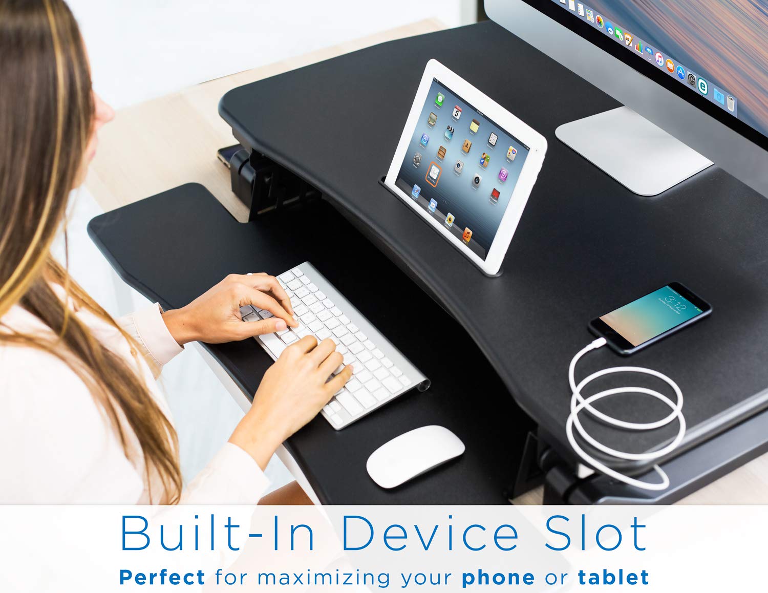 - Stay plugged in and charged: Keep your phone charged and close-by at all times with the built-in USB port on this adjustable desktop standing desk.
