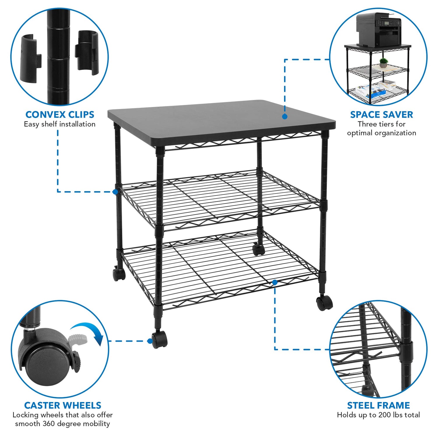 Details: Mount-It! black printer cart with wheels holds printers, scanners and fax machines off your desk, within easy reach on the deskside. Clear out your desktop space for a more ergonomic, organized and focused desk set up. This versatile and multi-functional cart is designed for use in offices, educational environments, mailrooms, cubicles, classrooms, dorm rooms and libraries. Sturdy construction, simple assembly, storage shelves and a wheeled base make it an ideal choice for a variety of home, office and educational environments. The printer stand's steel frame and durable laminate top offers stability and durability. Heavy-duty design can hold up to 200 lbs of equipment and supplies (100 lbs total on top shelf and 50 lbs on each of the wire shelves). Powder coat finish prevents chipping and scratching. Steel Tube and Wire Frame Offers Sturdy, Reliable Support Ample space from 24"Wide x 20"Deep shelves. Measures 26" High with the casters. 4 Wheels for Easy Mobility Around Your Work Area or Learning Space Two Locking Wheels Help Keep the Stand in Place During Use Two metal wire frames are height adjustable. Store printer supplies such as toner, paper, envelopes and other office essentials.