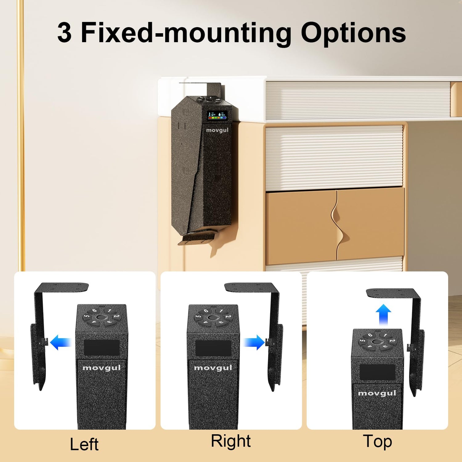 - Easy to Mount: You can mounted the hand gun safe on the top but it can also be mounted on the left or right. The drop down once open is smooth and quick for fast access. Its versatile design is suitable for various locations, desk, cabinet and nightstand, counter.