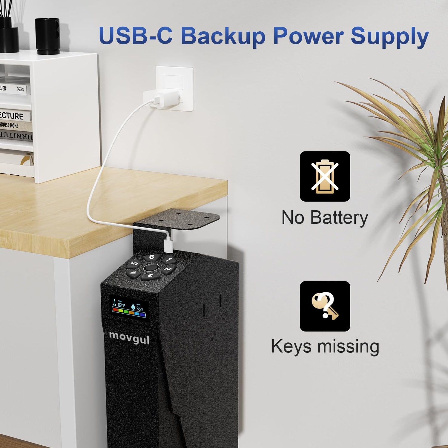 - USB-C Backup Power Supply: The gun safe for handgun includes a USB-C port for emergency power backup. In case of power outages or keys lost, you can plug in a power source and regain immediate access to your firearms.