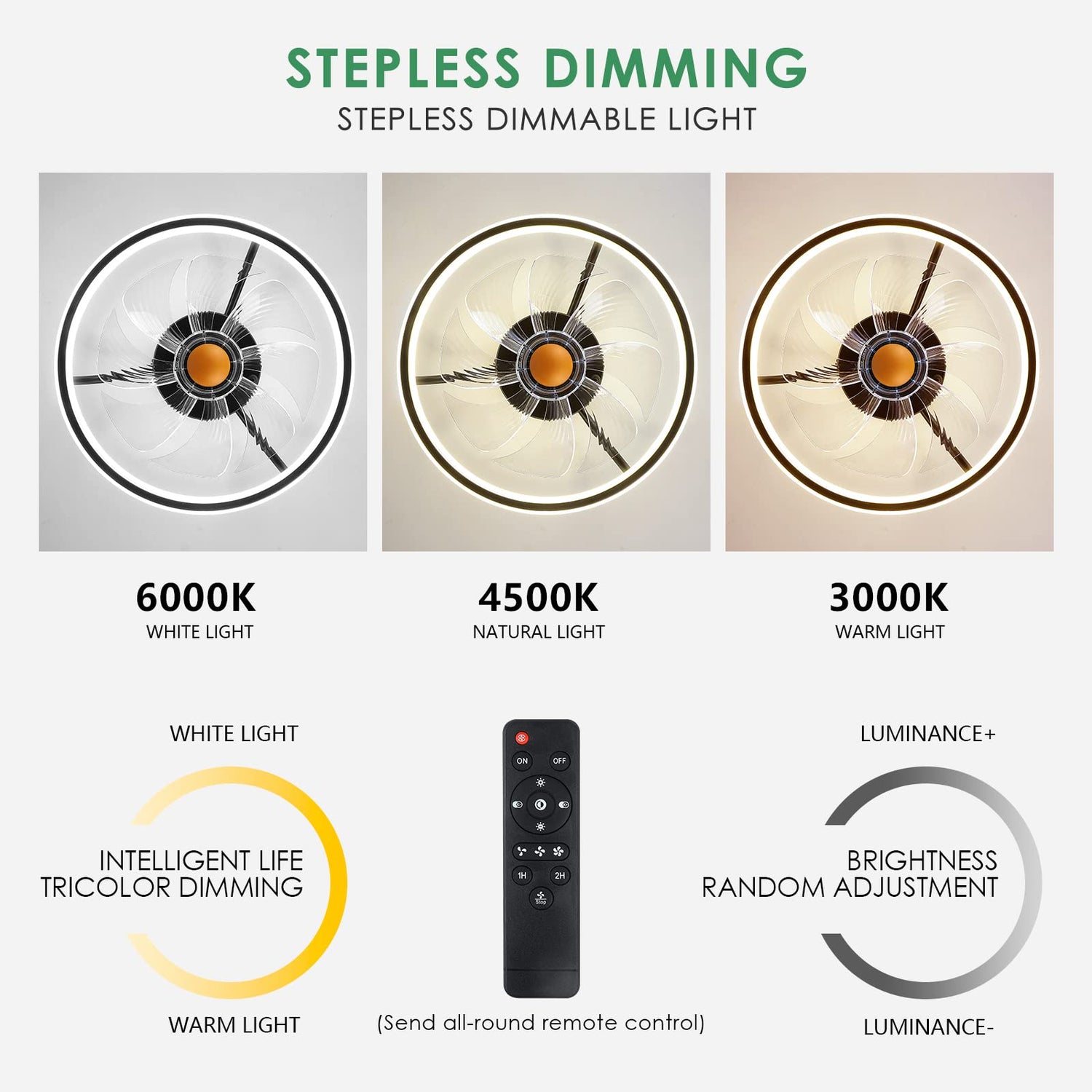 - ⭐【FLUSH MOUNT CEILING FAN】: The Low Profile Bladeless ceiling fan with light adopts 110V 100% Pure Copper motor and stepless dimming. There is no noise after the fan is turned on. Remote control the fan and light, and have a timing function to turn off the fan automatically after you fall asleep, ensure safety and save energy.