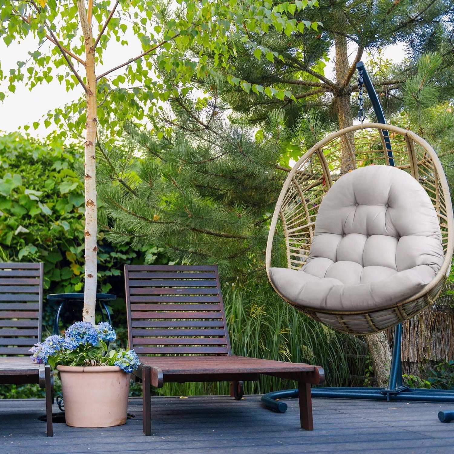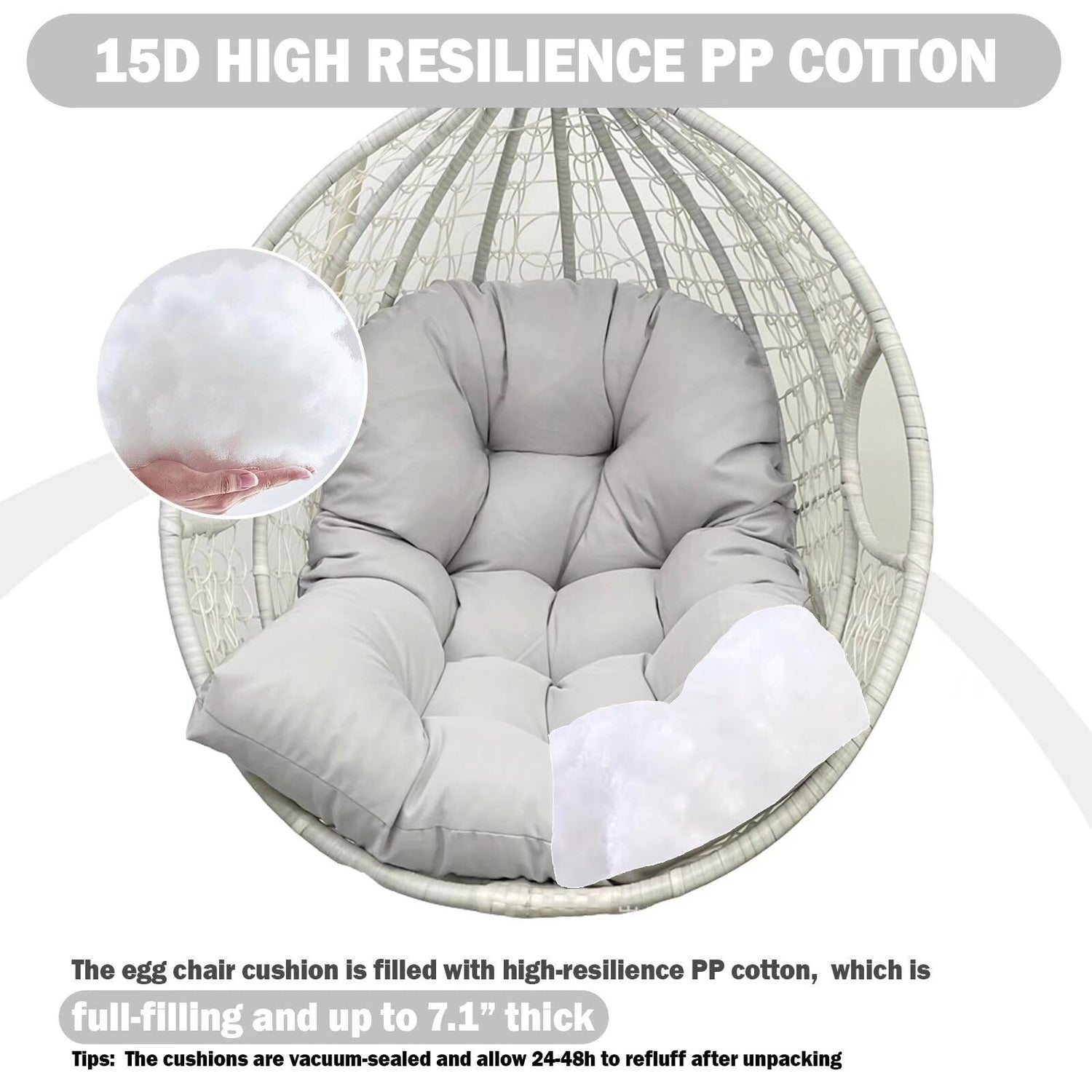 - 【Fluffing&Cleaning Skill】: The patio hanging egg chair cushion only is vacuum packed; please slap hard after unpacked and allow 48h for full fluffing; just spot clean with a damp cloth and hang to sun dry when the rattan chair seat cushions get dirty