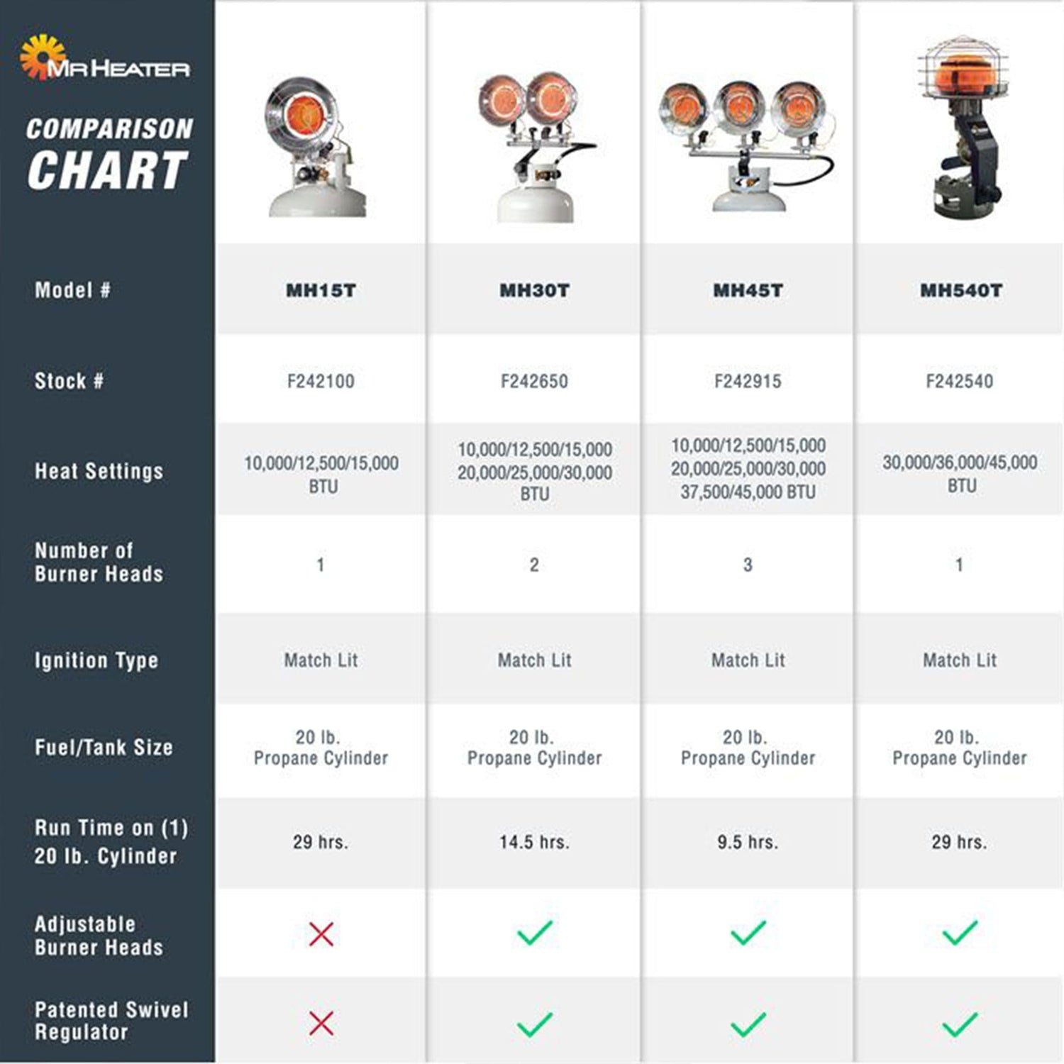 Details: Mr. Heater 45,000 BTU 540° Portable Tank Top Radiant Propane Heater is the ultimate outdoor heating companion for any adventure. Its versatile design makes it ideal for camping trips, tailgating parties, ice fishing, sporting events, and relaxing on porches. With three adjustable heat settings 45,000, 36,000, and 30,000 BTUs, you are easily able to customize the warmth to suit your needs, providing powerful radiant heat to keep you comfortable in any outdoor setting. With a unique 360° burner head and a 180° swivel bracket, it provides wide-reaching heat coverage in every direction, ensuring everyone stays warm. The convenient push-button TE valve allows for quick ignition, while the match-lit option provides a reliable backup, so you’ll never be left out in the cold. Safety is also paramount; the soft nose POL connection guarantees a secure, leak-free seal between the LP tank and the heater, while the tip-over safety shut off ensures it will only operate while upright, giving you peace of mind during operation. Built with high-quality stainless steel components, this LP tank heater is designed to withstand the rigors of outdoor use. Whether you’re enjoying a day at the campsite or cheering for your favorite team at a tailgate, the 540° Heater will keep you warm and comfortable, making it a must-have for all your outdoor activities.