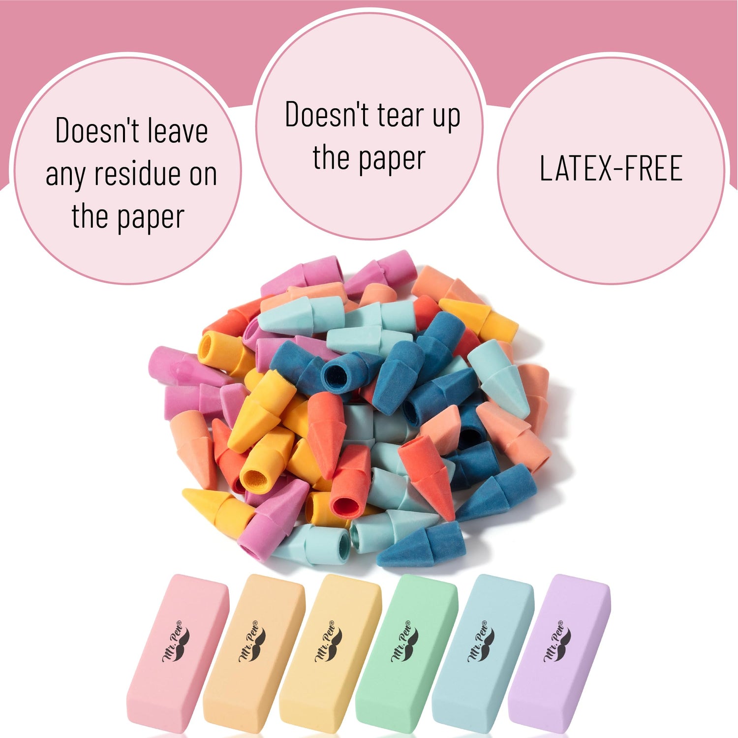 - Mr. Pen pencil erasers set includes 66 pieces, featuring 6 large erasers and 60 pencil top erasers, providing you with a variety of options for all your erasing needs.