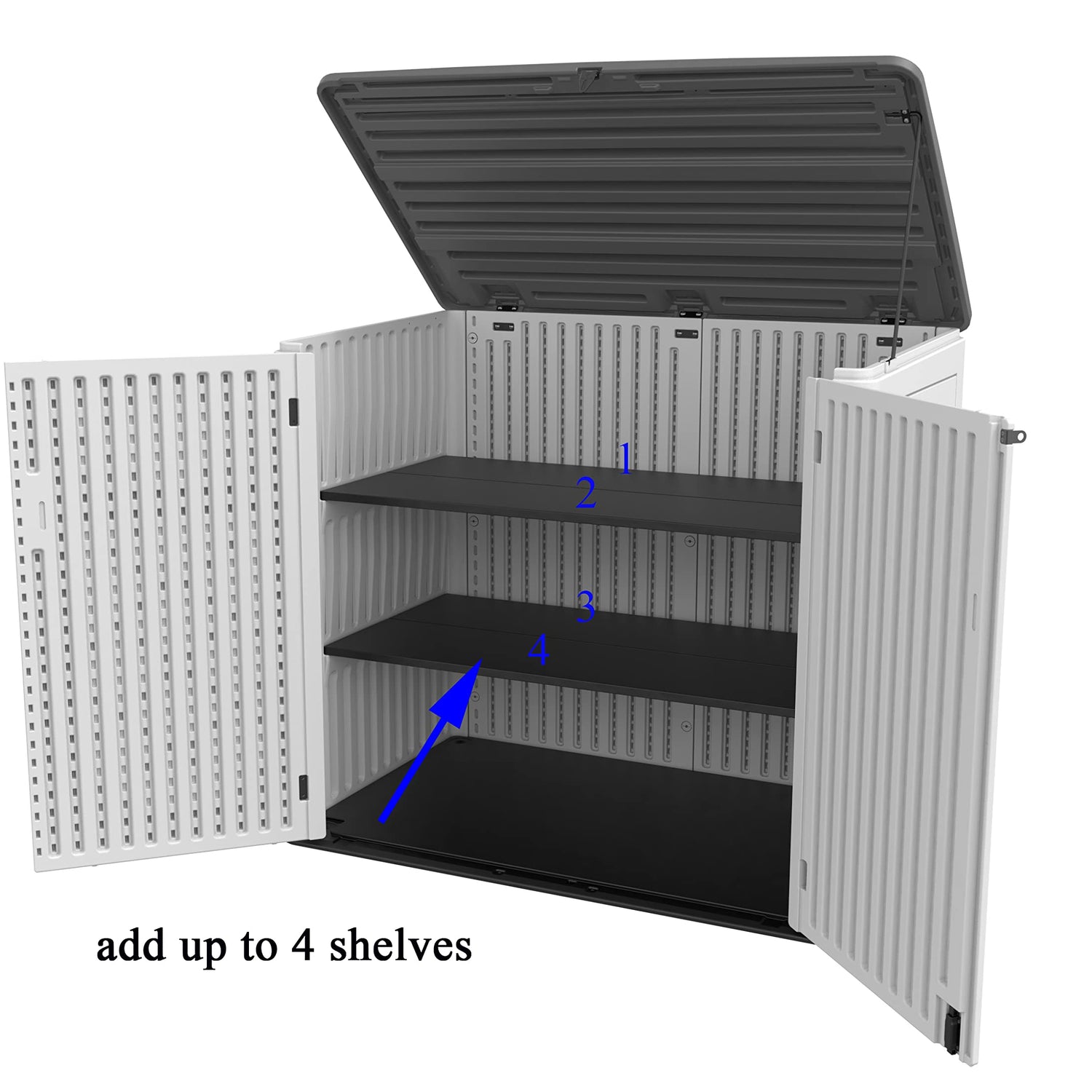 - CUSTOMIZED METAL SHELVES: Plastic shed designed to add up to 4 shelves,maximize the small shed storage capacity and keep all contents organized. Shelf sold separately.