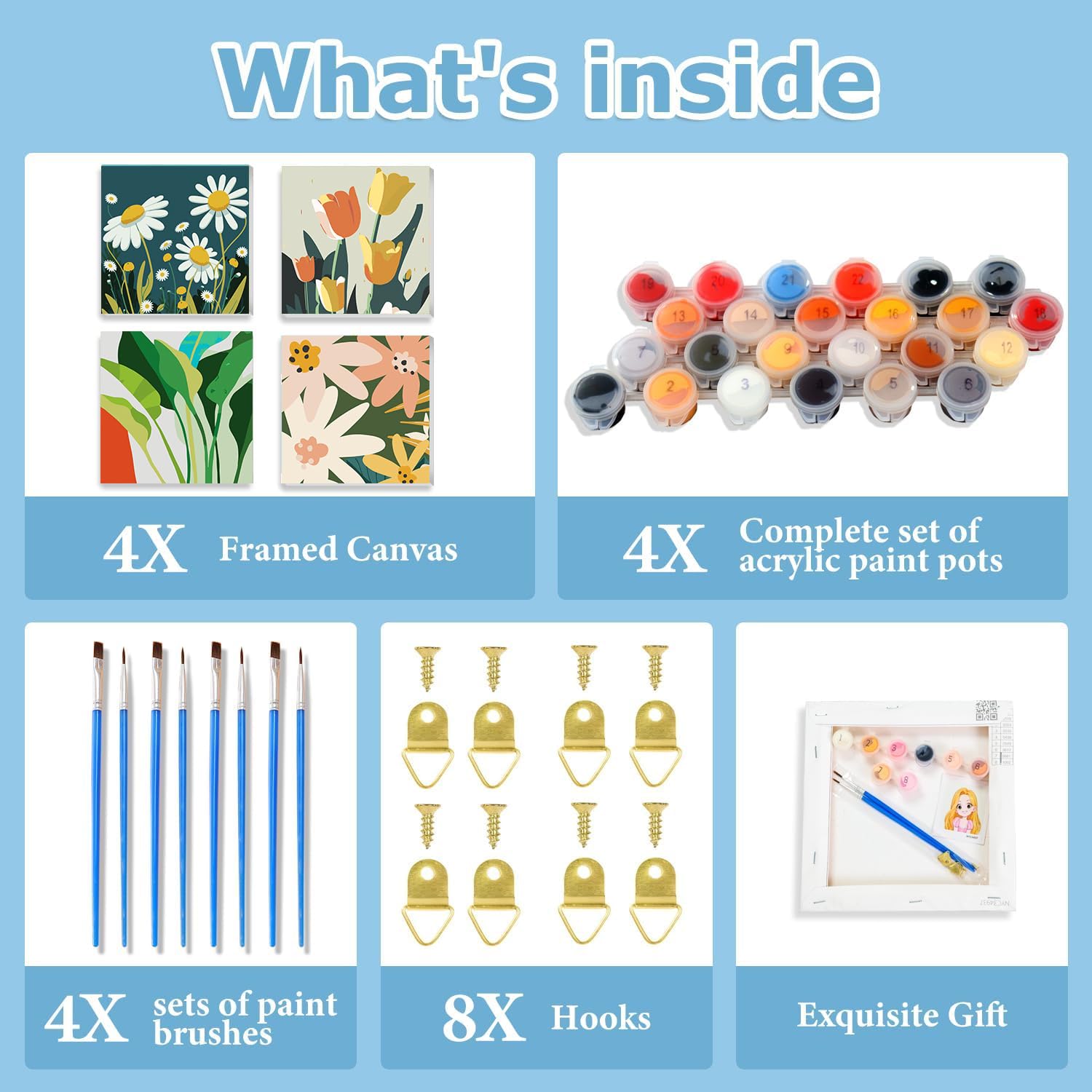 - What You Will Receive:With the purchase of 4 Pack Flowers Paint by Number Kits you will get:4 pre-printed textured art canvas(Canvas Framed),4 set of acrylic paints,4 set of paint by number brushes,4 set of hooks.You only need to color according to the numbers to complete beautiful oil paintings.