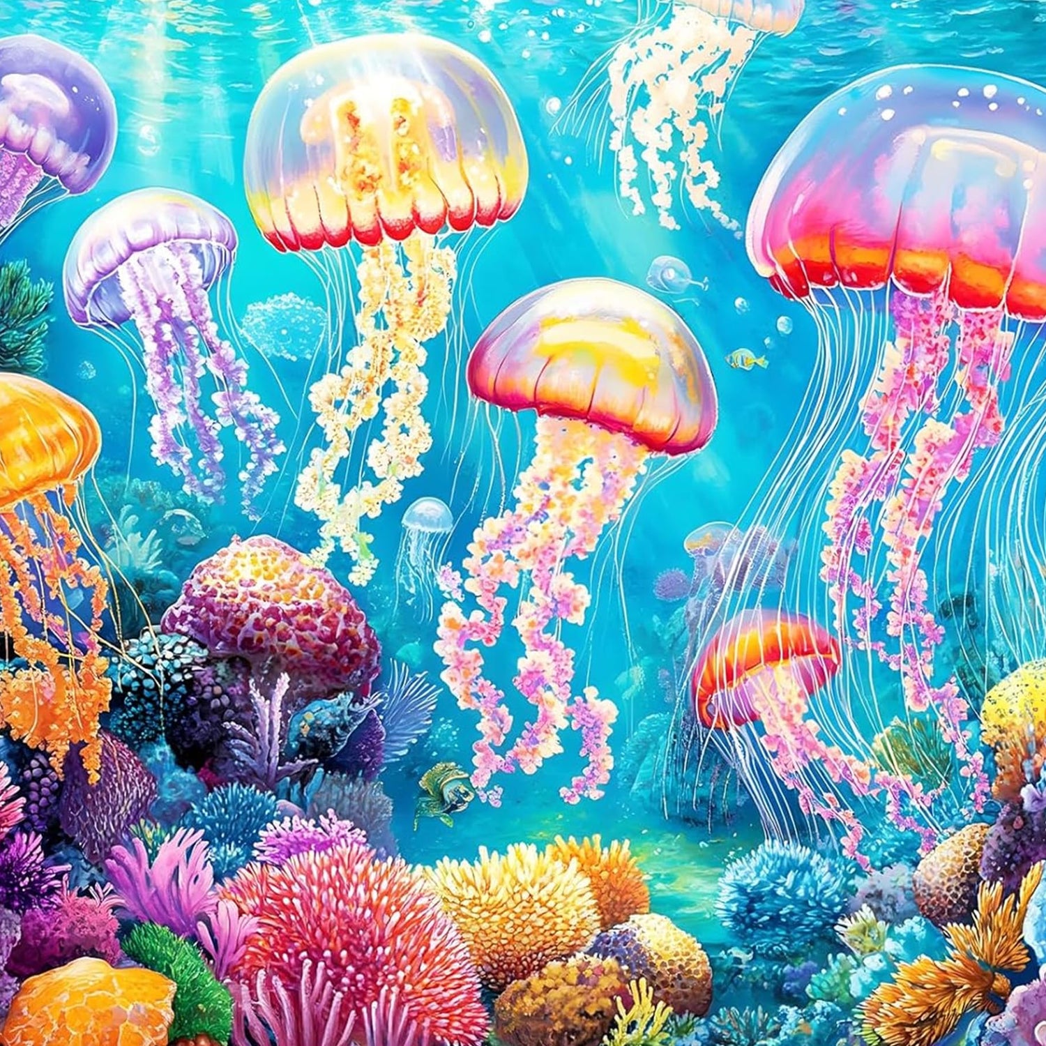 - What You Will Get: Each glowing jellyfish diamond painting kit comes with everything you need to get started! I premium full-drill adhesive canvas with printed legend, 5D round diamond drills in labeled packaging, 1 diamond applicator pen, 1 wax to pick up diamonds using an applicator pen, and 1 tray for holding diamonds.