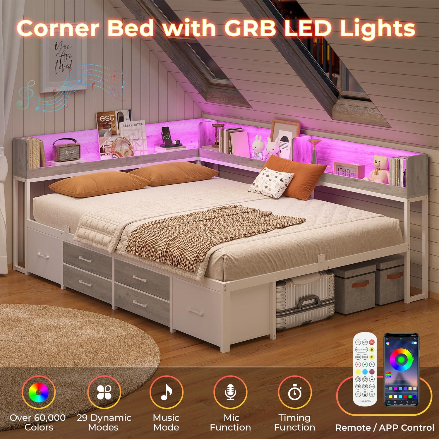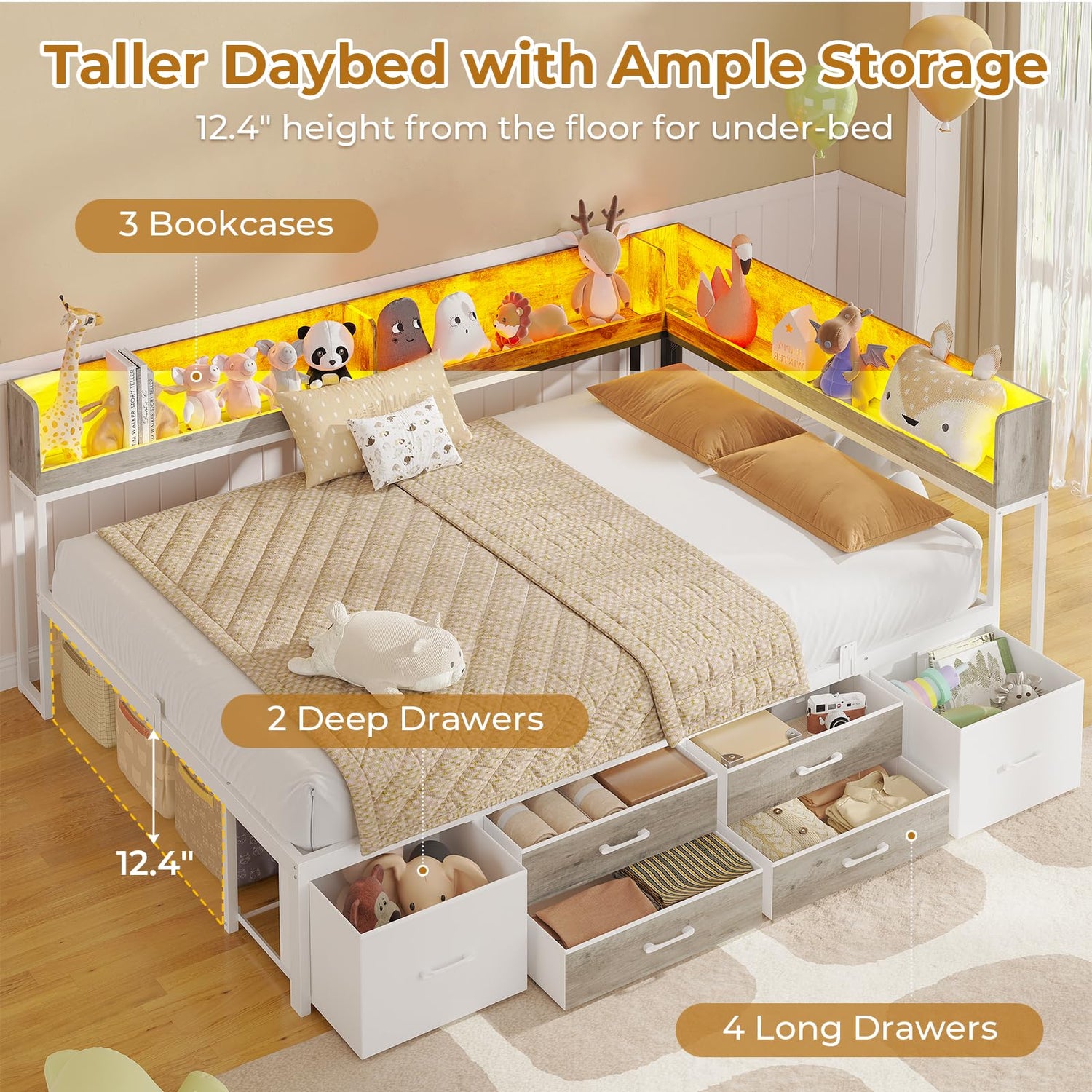 MSmask 14 Inch Corner Bed Frame with Bookcase Storage, Full Daybed with 6 Drawers, Charging Station and LED Light, Full Size Metal Platform Bed Frame for Kids Teenagers, White & Oak Grey