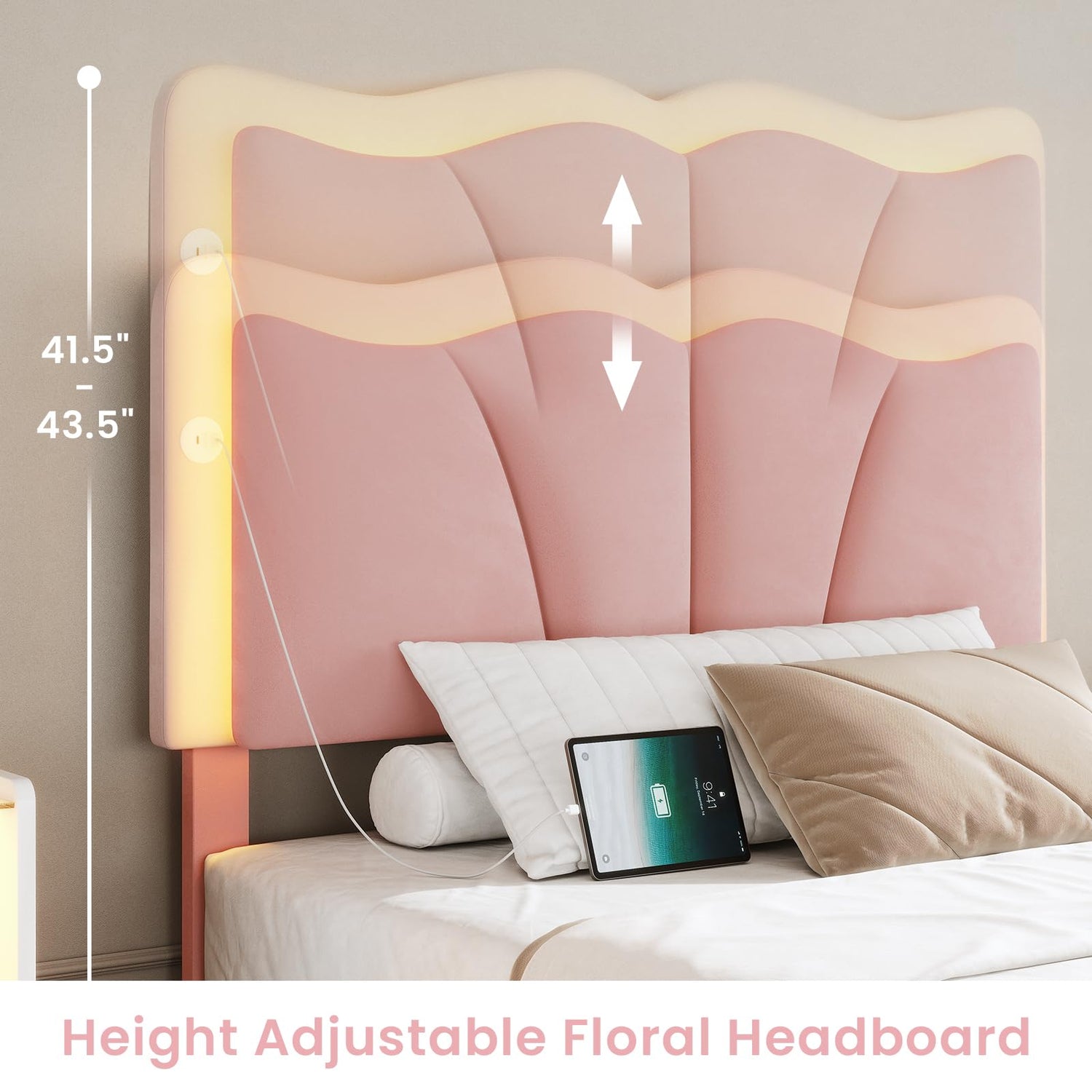 - 【Height Adjustable Headboard】This led twin bed frames with headboard is made of top velvet fabric and filled with a high-density sponge for a soft and comfortable touch. The velvet upholstered headboard can be adjusted from 41.5’’ to 43.5’’, which allows you to use the mattress height of 8’’-14’’. Features a unique tulip pedal shape design with curved edges, this pink twin bed frame with LED lights brings glamour and elegance to your bedroom.
