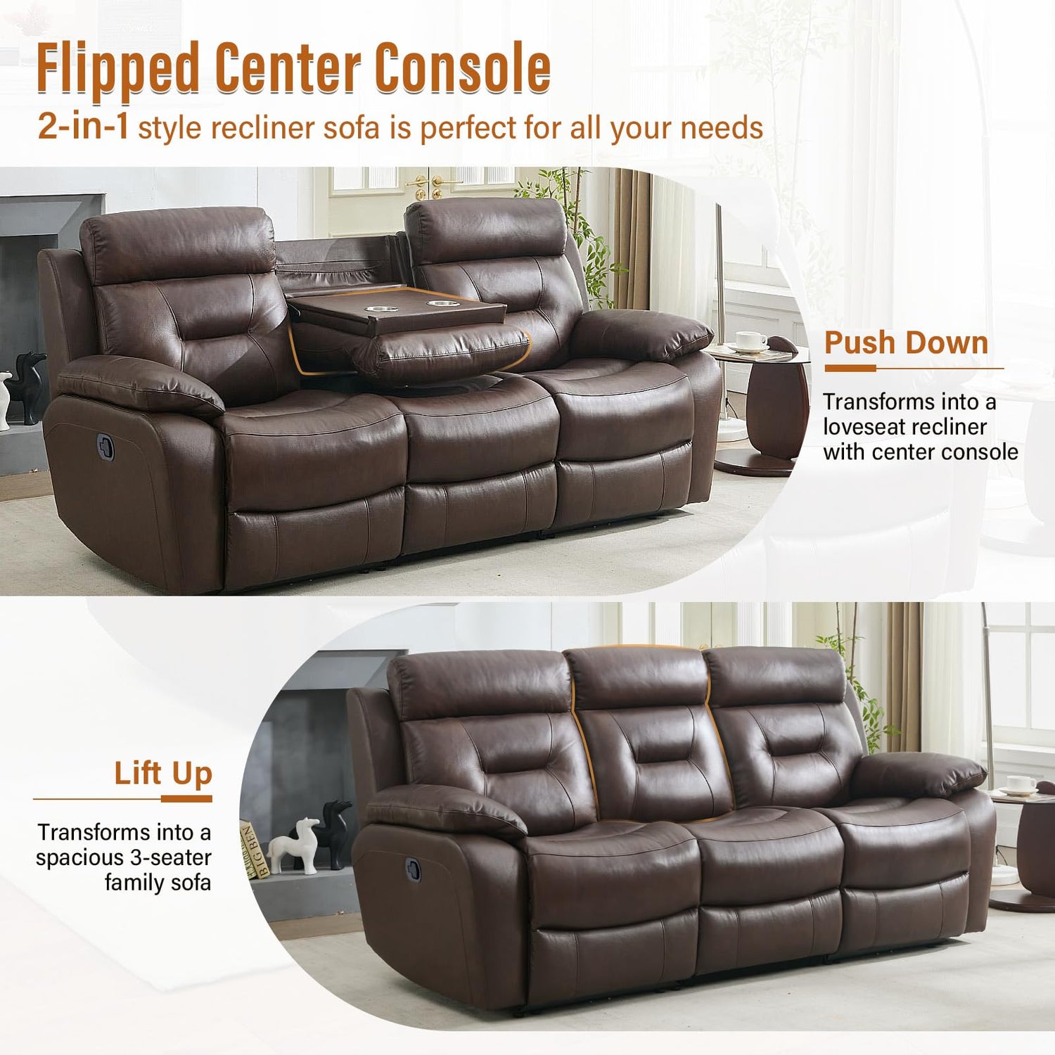 Msutree Genuine Leather Manual Reclining Sofa with Console, Oversized 3 Seater Reclining Chair, Top Grain Leather Recliner Sofa, Modern Couch for Living Room, with Drop-Down Table, Cupholders, Brown