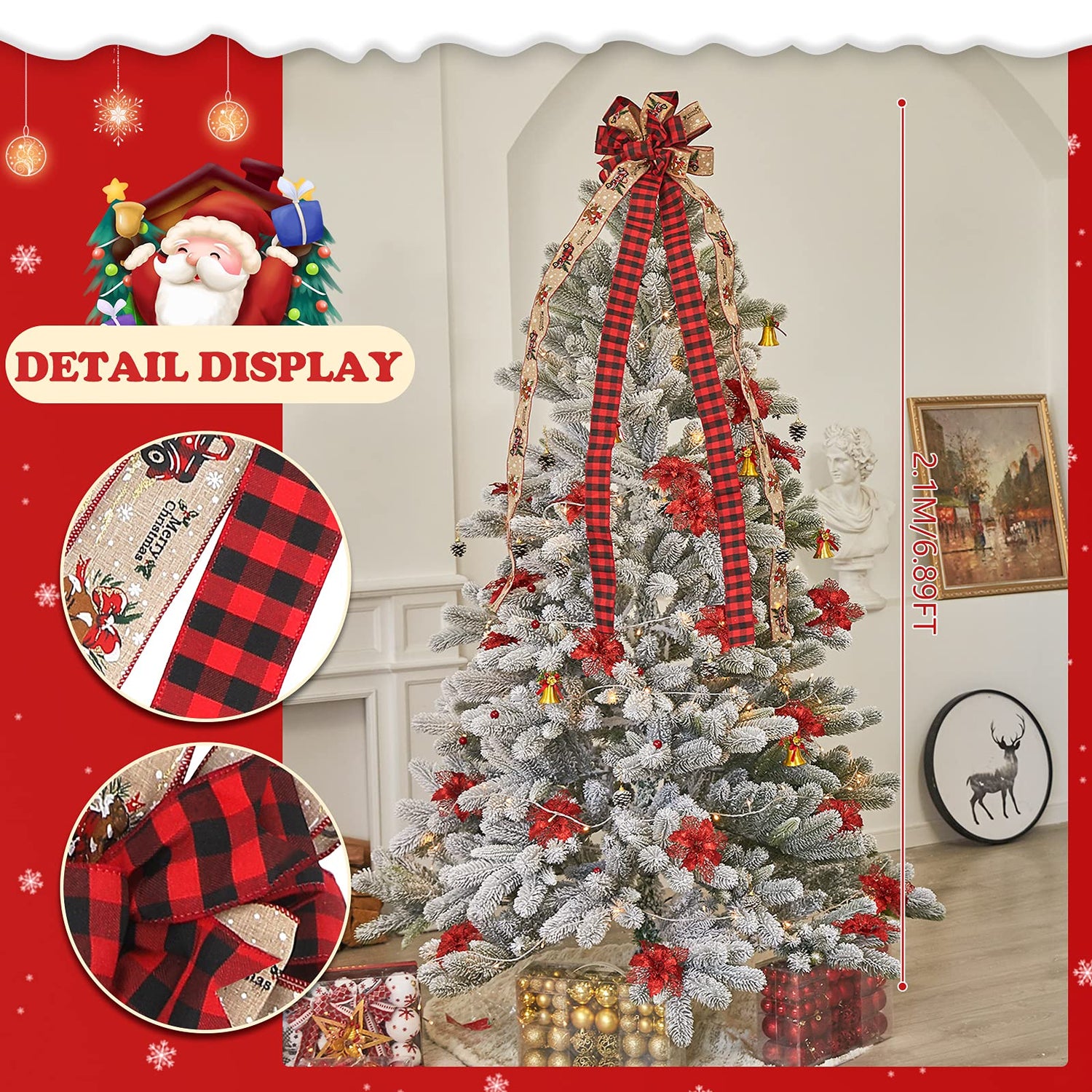 Details: Specifications: Material: cloth Color: red and black Size:13 x 56 Inch / 32x 144cm (L*W). Package includes: 1 x Christmas Tree Topper Bow ✔Ideal hanging accessories for archway or Christmas tree while wedding, birthday, ceremony, or holiday season. Full of Christmas holiday feeling, they can bring a lot of fun to your Christmas celebration ✔Use it on top of your tree, as the perfect conclusion to a wonderful wrapping job, or to decorate your indoor or outdoor staircases and poles.