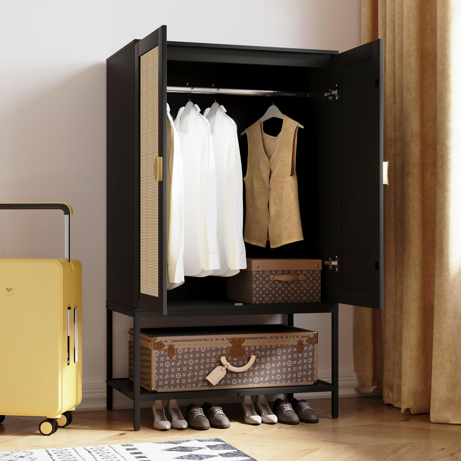 MtuxuYR Bedroom Armoire,Wooden Rattan Armoires Metal Frame with Large Storage Space & Elegant Handle 2 Doors for Bedroom(Black)