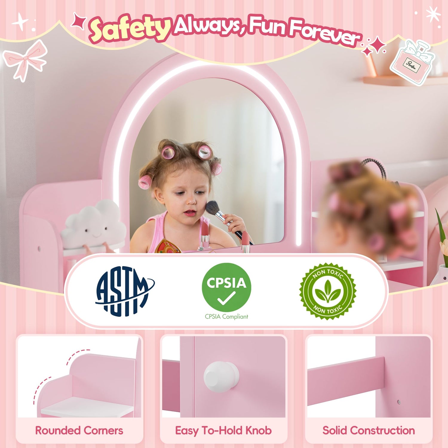 MU Kids Vanity with Lights, Princess Makeup Vanity Desk with Open Bookshelf, Storage Cabinet & Shelves, 2 in 1 Toddler Vanity Table & Chair Set with Lighted Mirror for Little Girls, Pink