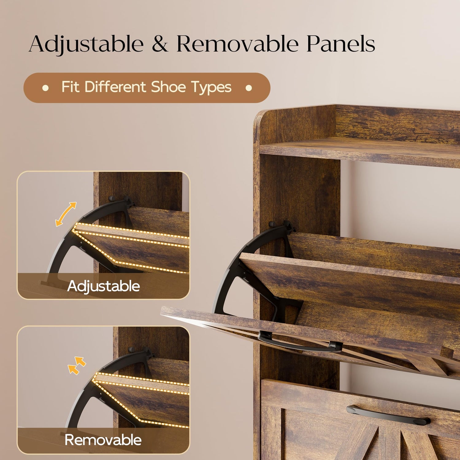 - Space-Saving Flip Drawer Design: Our freestanding shoe cabinet features a space-saving flip drawer design that’s easy to open and close. Each compartment includes a removable divider, allowing you to customize storage based on shoe size or style.