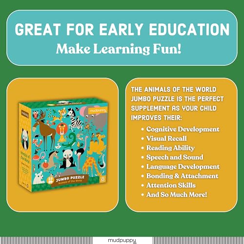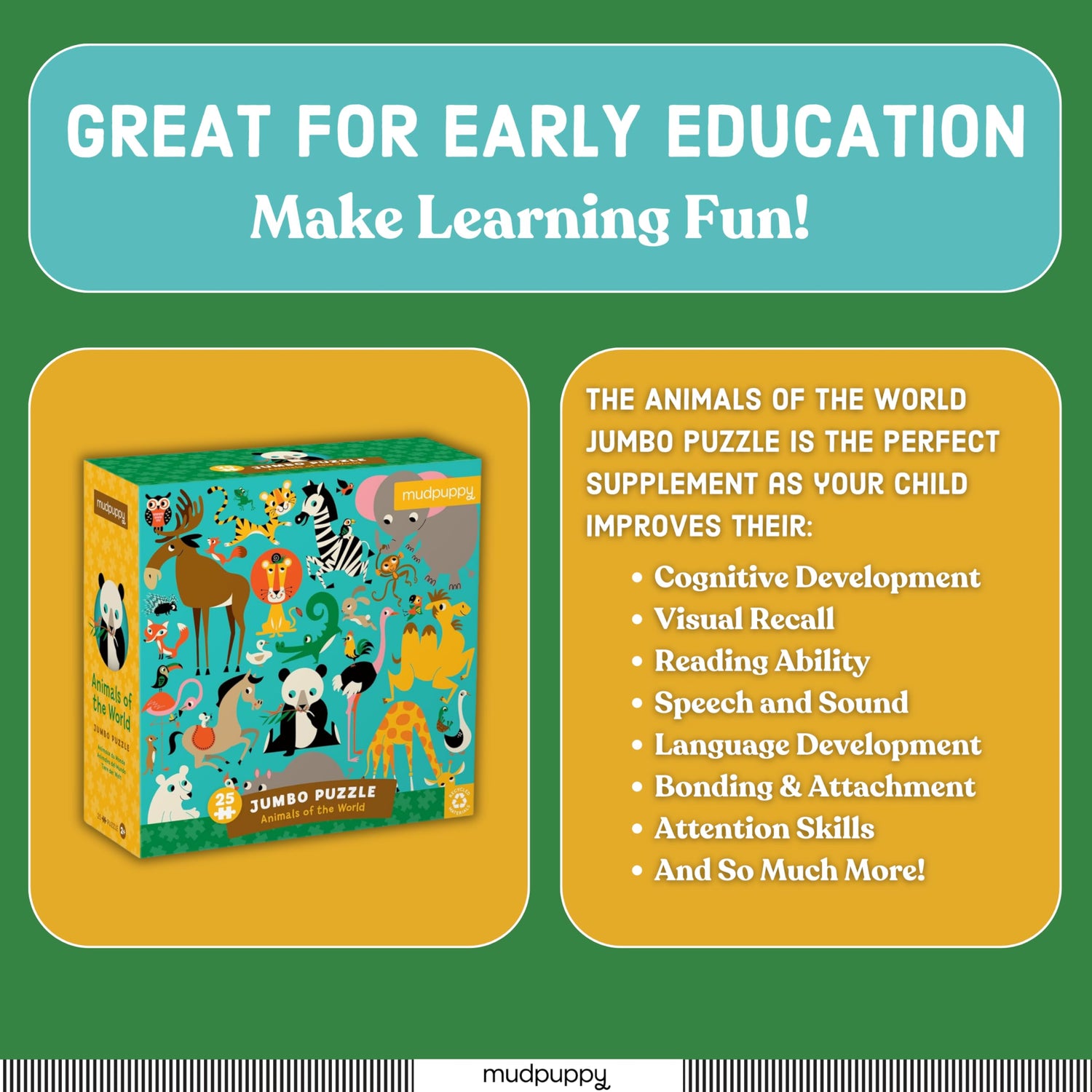 - JUMBO PUZZLE – The Animals Of The World Jumbo Puzzle from Mudpuppy is a 25 Piece Jigsaw Puzzle that features all the different kinds of animals from all over the world! The extra-large pieces are just the right size for little hands to manipulate. The puzzle is a great activity for kids to do alone or for families to join in and solve the puzzle together, all while creating a positive bonding experience for young ones. The box shows the completed puzzle artwork and is an ideal place to keep pieces safe and free from damage.