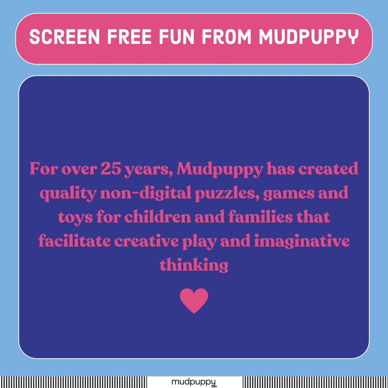 - MUDPUPPY - For over 25 years, Mudpuppy has created quality non-digital puzzles, games and toys for children and families that facilitate creative play and imaginative thinking. One of our core design principles is to engage kids and promote learning without the use of digital screens or technology. Mudpuppy is committed to designing and producing eco-friendly products that have a minimal carbon footprint. All Mudpuppy products adhere to CPSIA, ASTM, and CE Safety Regulations