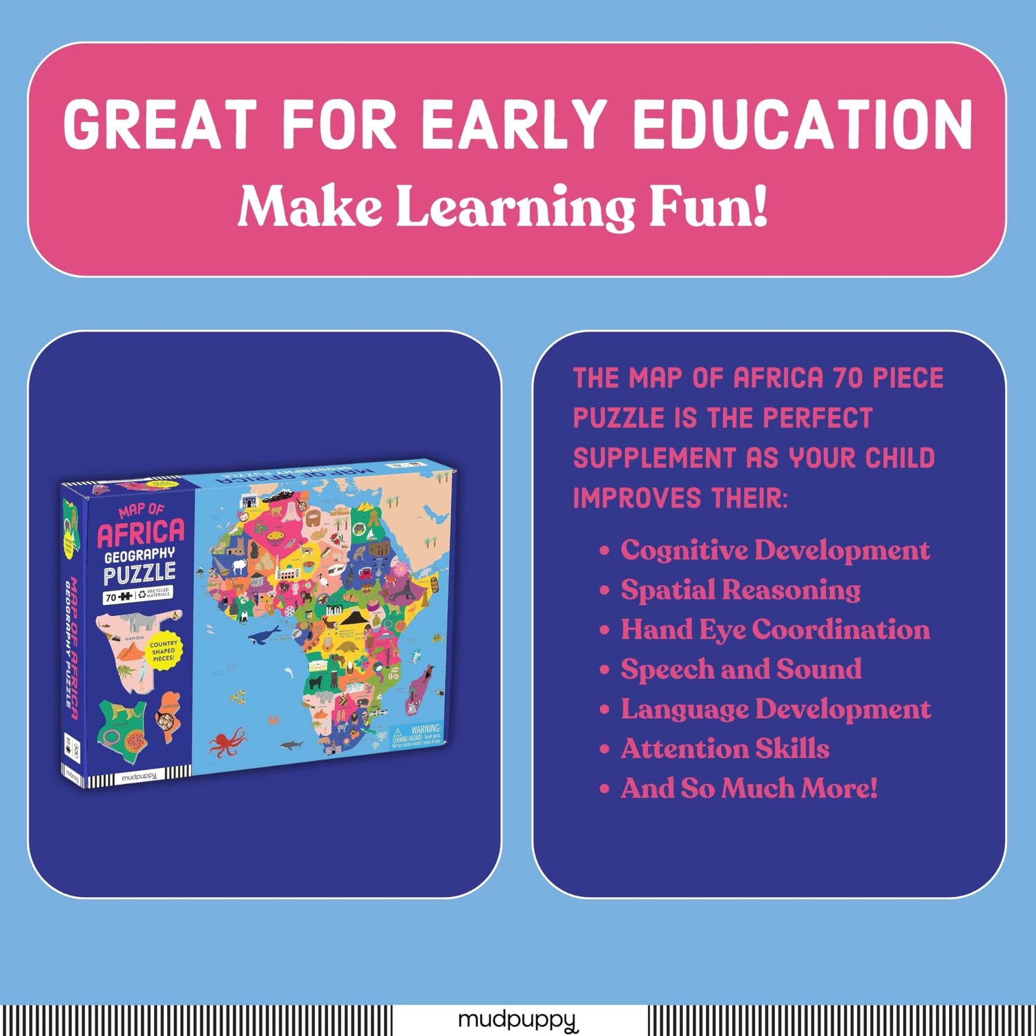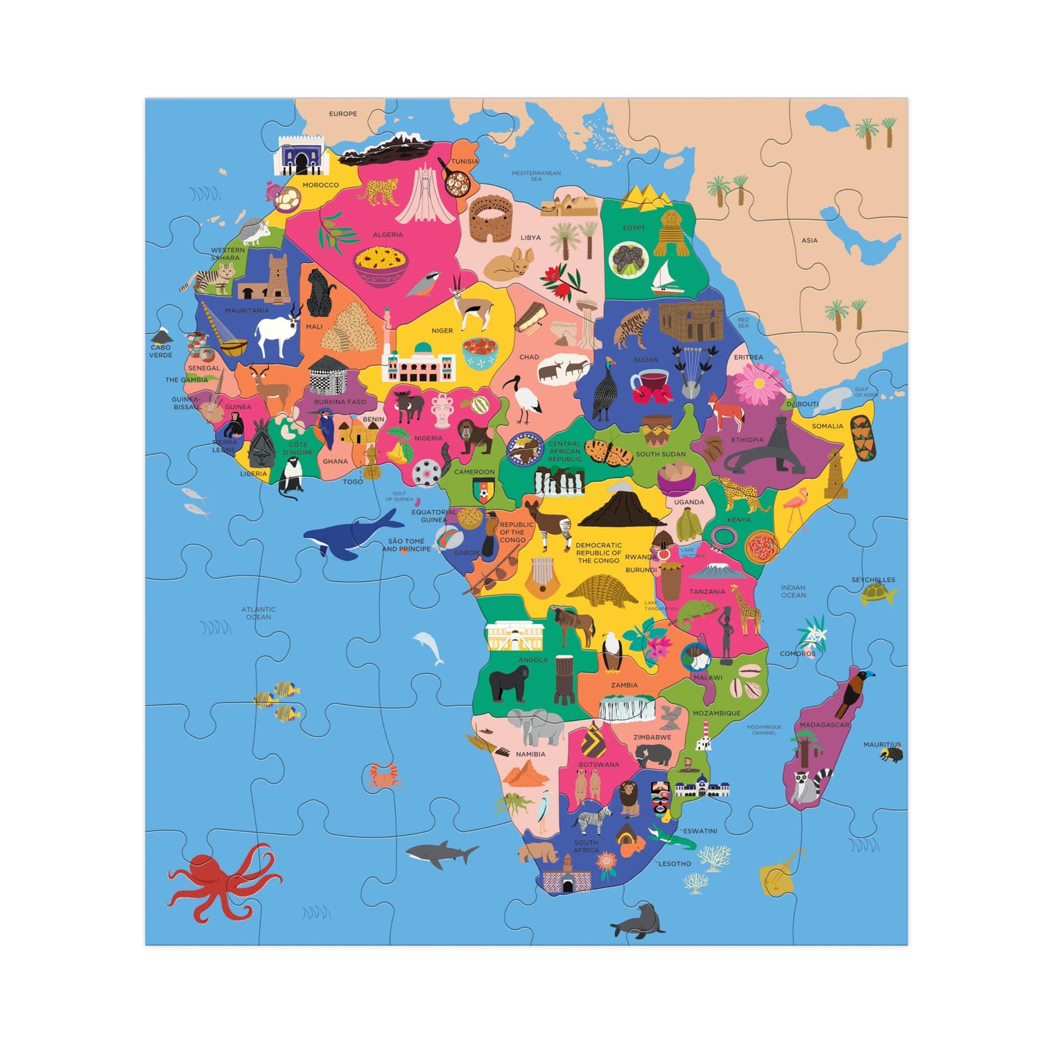 - GEOGRAPHY PUZZLE – The Map Of Africa Puzzle from Mudpuppy is a 70 Piece Shaped Jigsaw Puzzle that features African countries by name, geographical shape and location from the colorful and whimsical illustrations of the map puzzle along with country shaped puzzle pieces. The puzzle is a great activity for kids to do alone or for families to join in and solve the puzzle together, all while creating a positive bonding experience for young ones. The puzzle includes an icon key of famous landmarks along with the full puzzle image for reference.