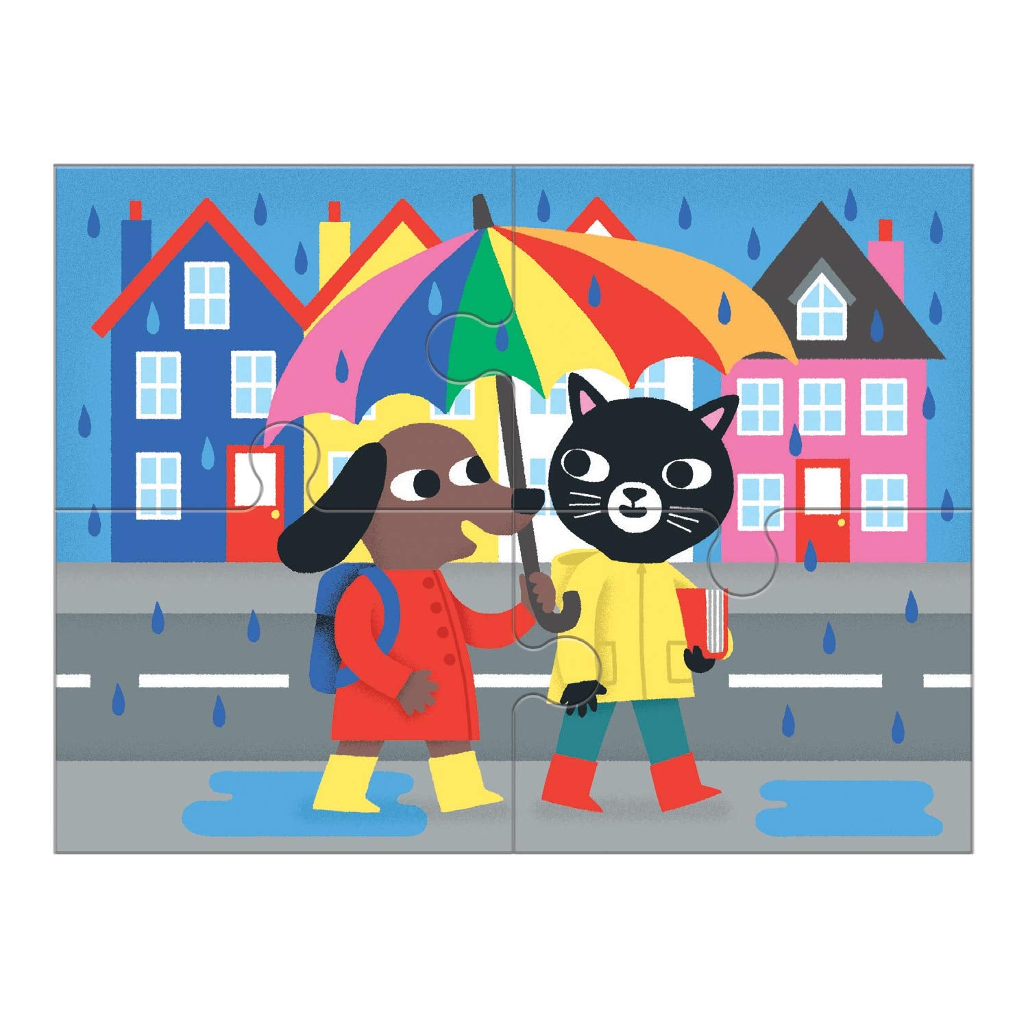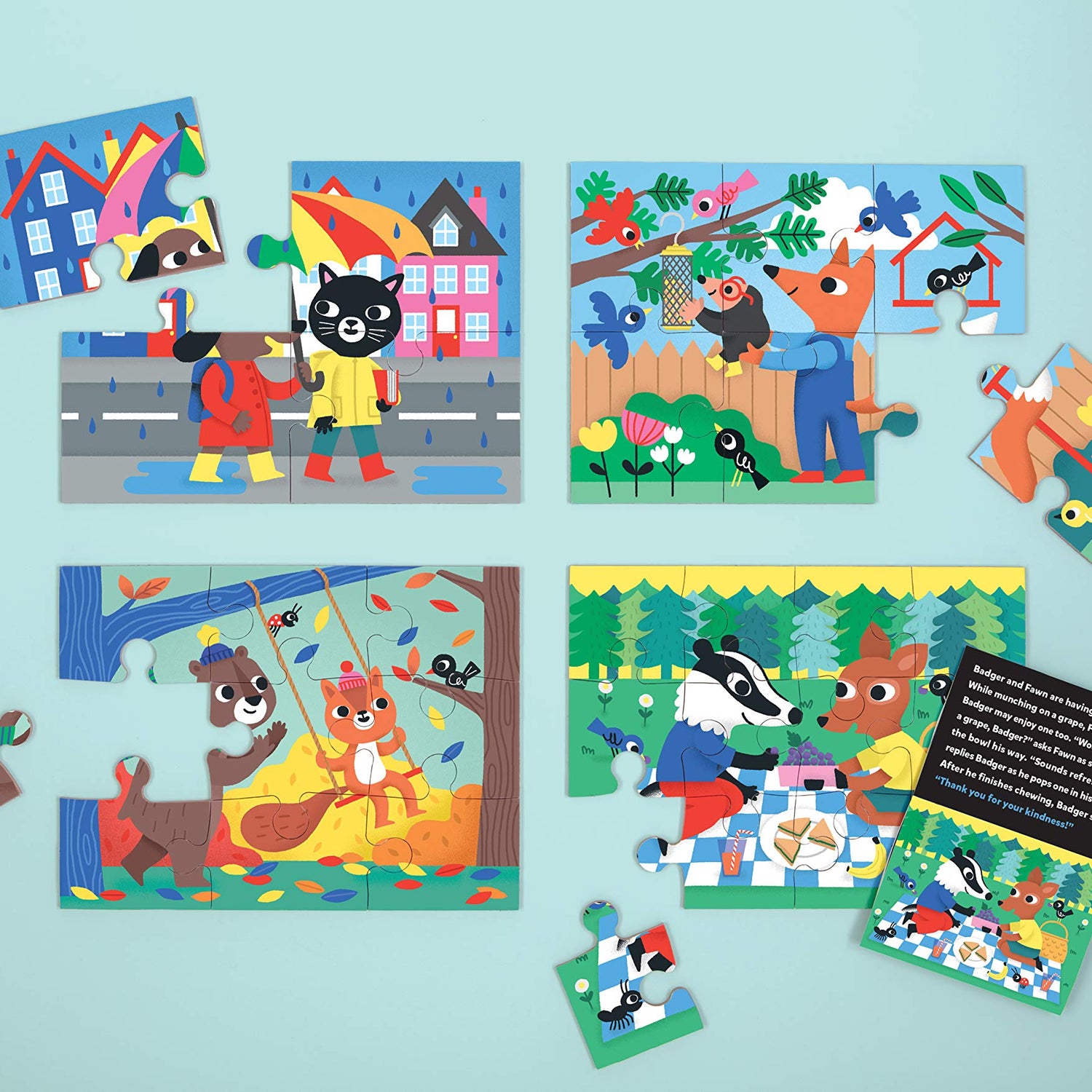 Details: Kindness 4-in-a-Box Puzzle Set from Mudpuppy includes 4 puzzles, each with a different level of difficulty. Puzzles with 4, 6, 9 and 12 pieces reveal color illustrated scenes featuring adorable animal demonstrating acts of kindness.